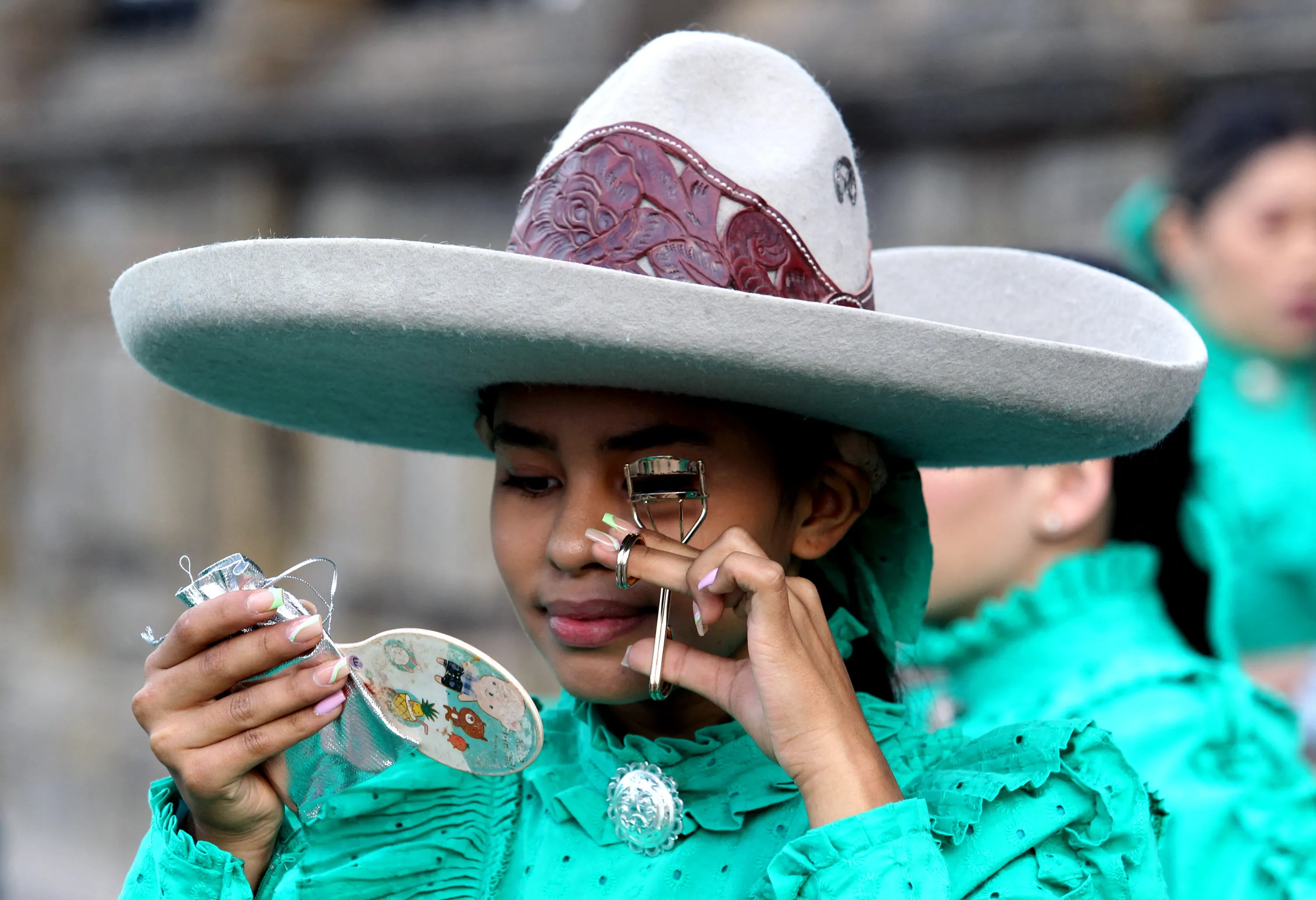 A woman dressed like a Escaramuza charra (traditional cowgirl) prepares to parade on the “International Day of Charro and Charrería” in Guadalajara, state of Jalisco, Mexico on September 14, 2022. The Mexican charrería was declared in 2016 Intangible Cultural Heritage of Humanity by Unesco. (Photo by Ulises Ruiz/AFP Photo)
