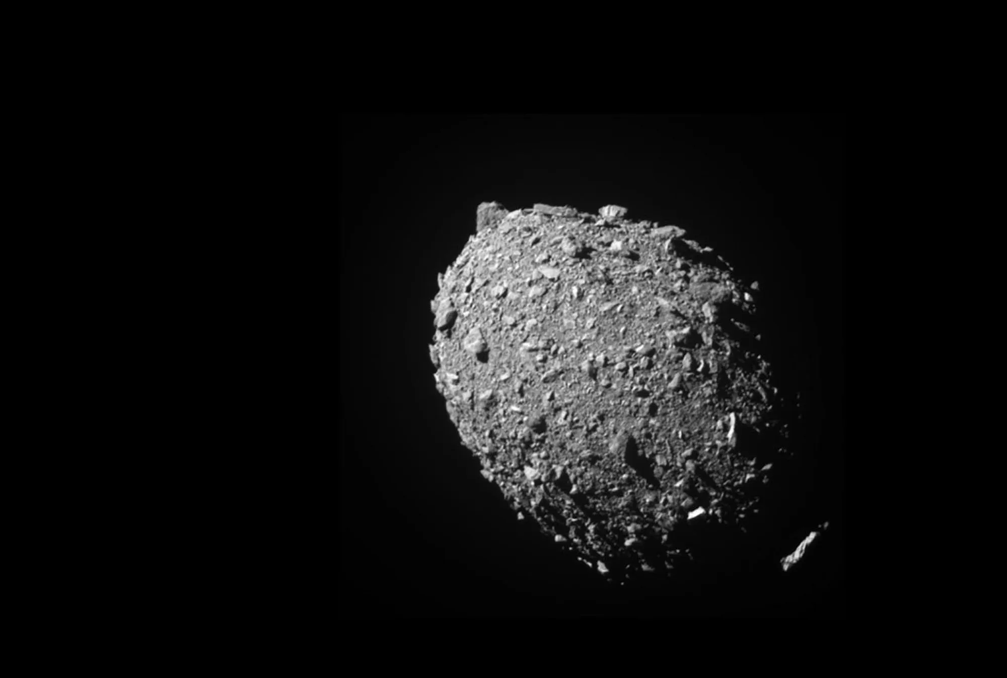 Asteroid moonlet Dimorphos as seen by the DART spacecraft 11 seconds before impact. DART’s on board DRACO imager captured this image from a distance of 42 miles (68 kilometers). This image was the last to contain all of Dimorphos in the field of view. Dimorphos is roughly 525 feet (160 meters) in length. Dimorphos’ north is toward the top of the image. (Photo by NASA/Johns Hopkins APL)