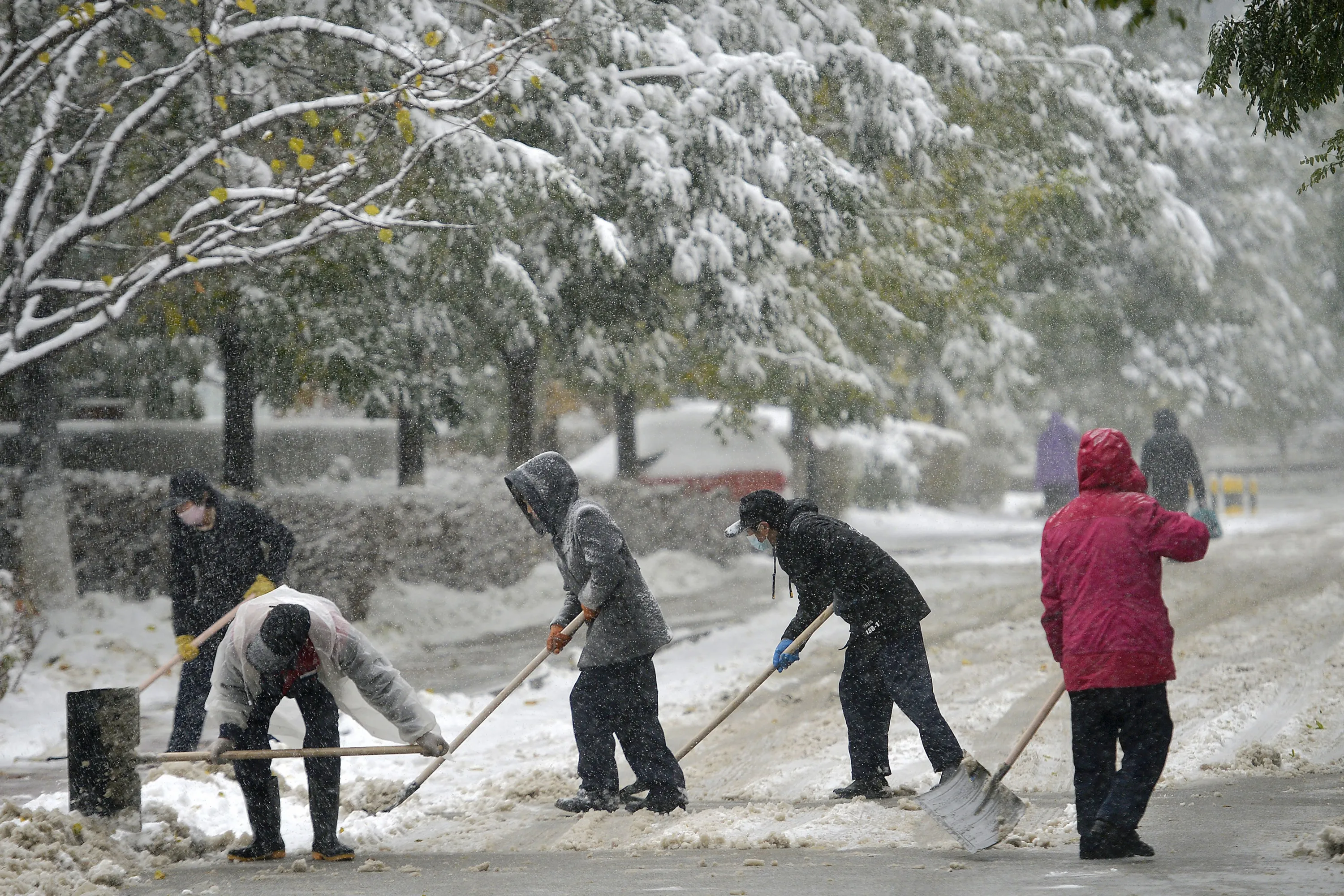 People shovel a street during snowfall in Shenyang, in China's northeastern Liaoning province on November 6, 2023. (Photo by AFP Photo/China Stringer Network)