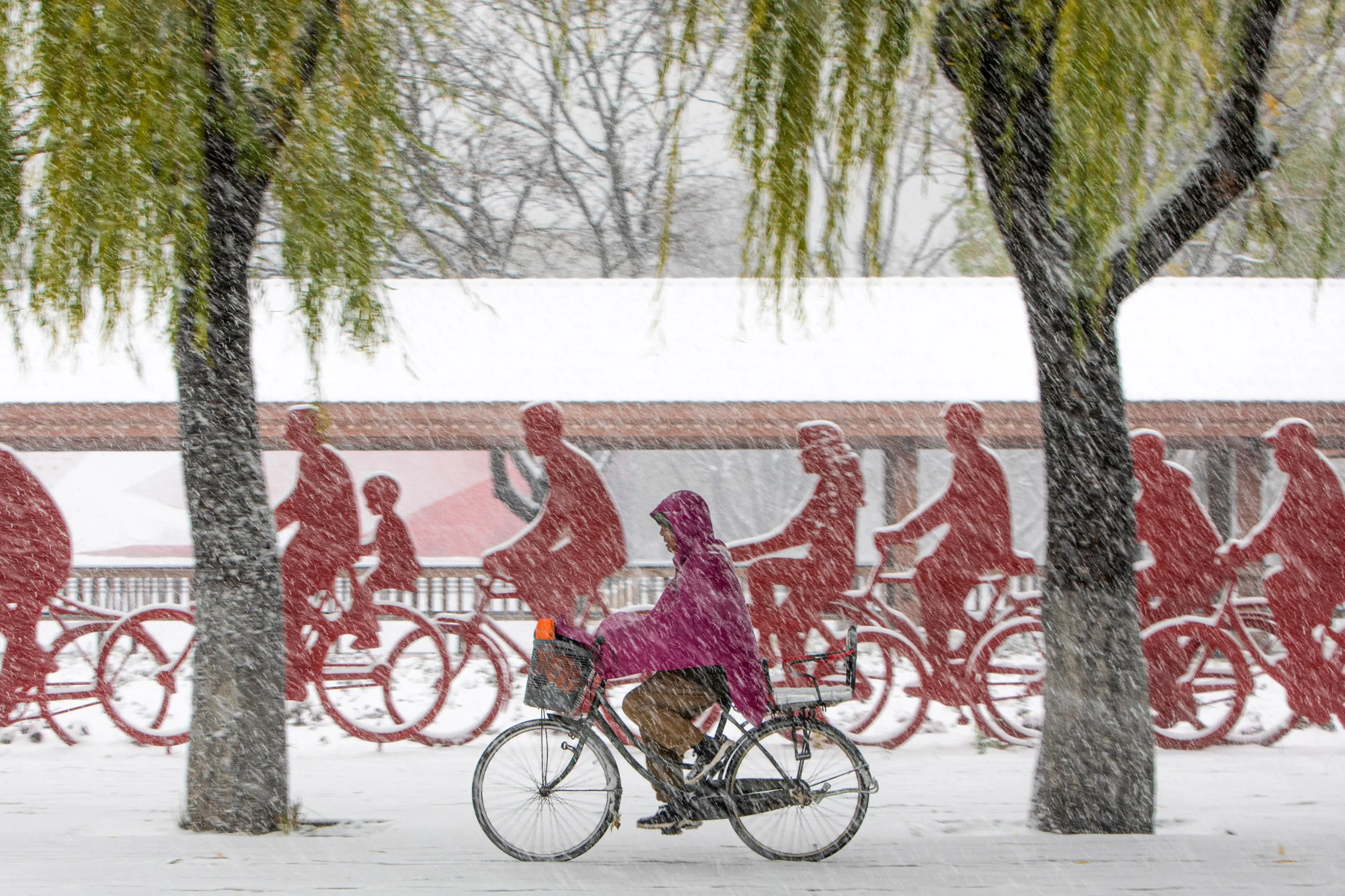 This photo taken on November 6, 2023 shows a person riding bicycle as it snows in Shenyang, in China's northeastern Liaoning province. (Photo by AFP Photo/China Stringer Network)