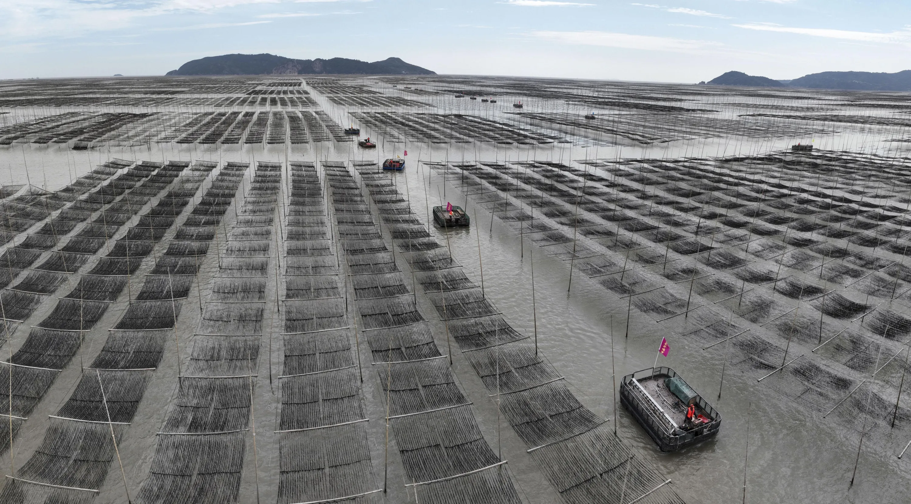 Aerial view of farmers on boats harvesting nori, an edible seaweed, at Dayu Bay on November 7, 2023 in Wenzhou, Zhejiang Province of China. (Photo by VCG/VCG via Getty Images)