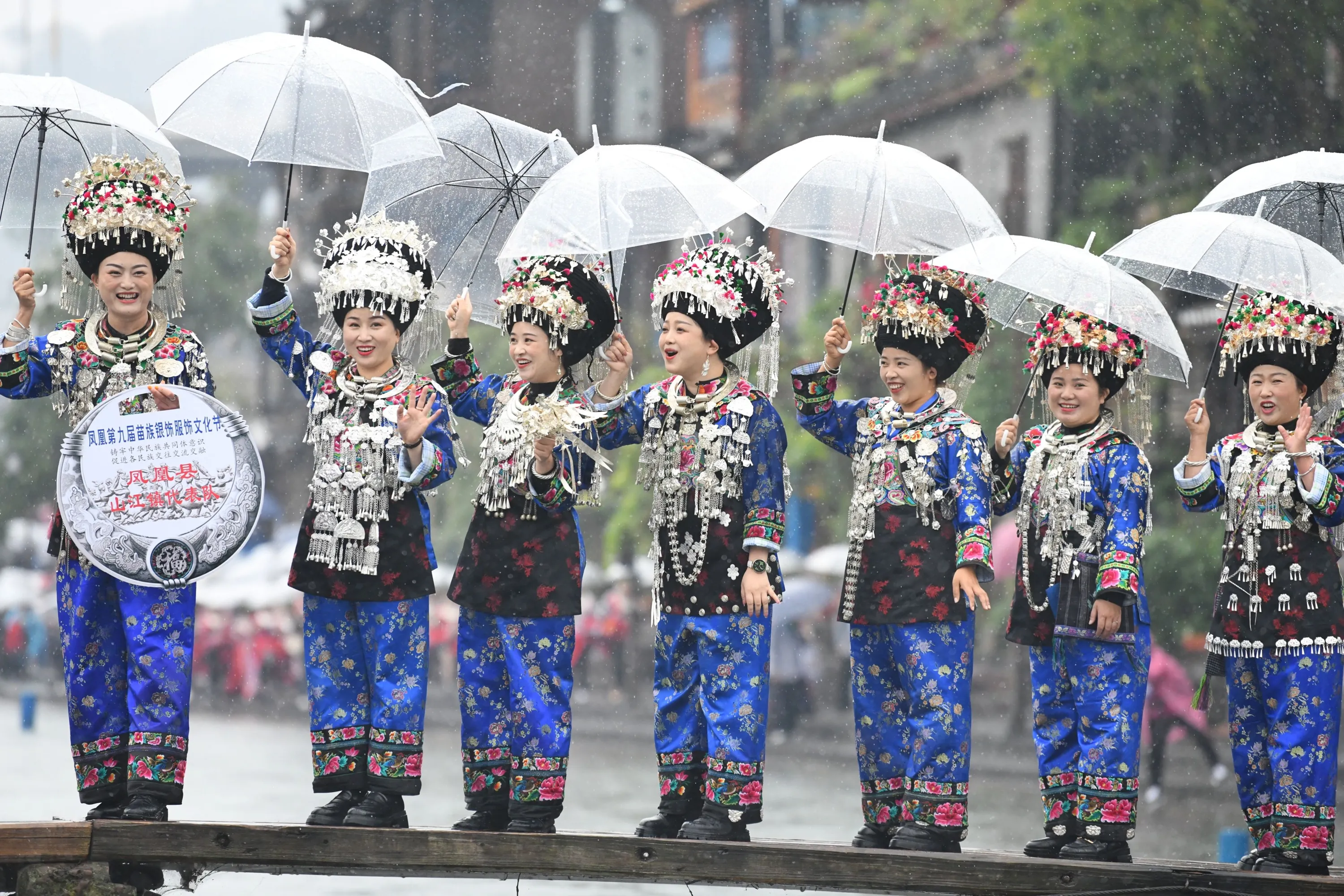 Miao women holding umbrellas stand on a wooden bridge to show traditional Miao costumes during a clothing culture festival at Fenghuang Ancient Town on November 10, 2023 in Xiangxi Tujia and Miao Autonomous Prefecture, Hunan Province of China. (Photo by Yang Huafeng/China News Service/VCG via Getty Images)