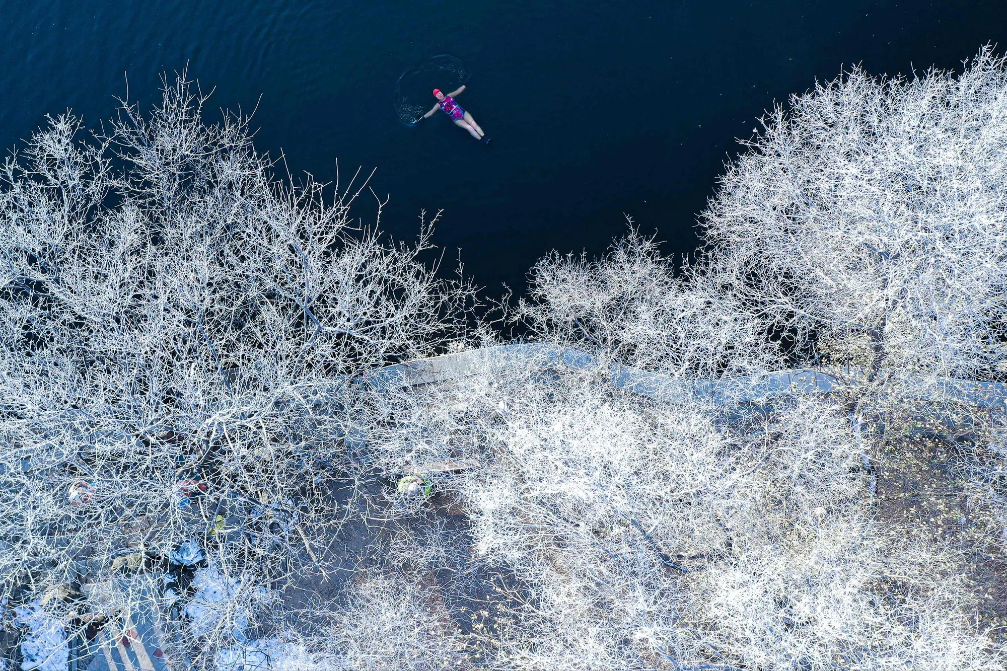 This photo taken on November 12, 2023 shows a winter swimming enthusiast braving the cold temperatures as she swims at Beiling Park in Shenyang, in China's northeastern Liaoning province. (Photo by AFP Photo/China Stringer Network)