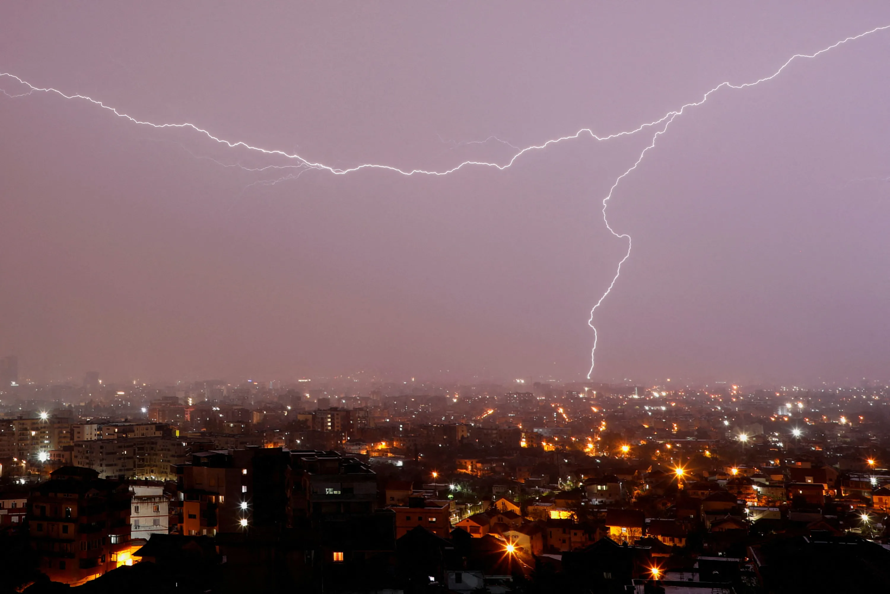 Lightnings flash over Tirana, Albania on April 24, 2023. (Photo by Florion Goga/Reuters)