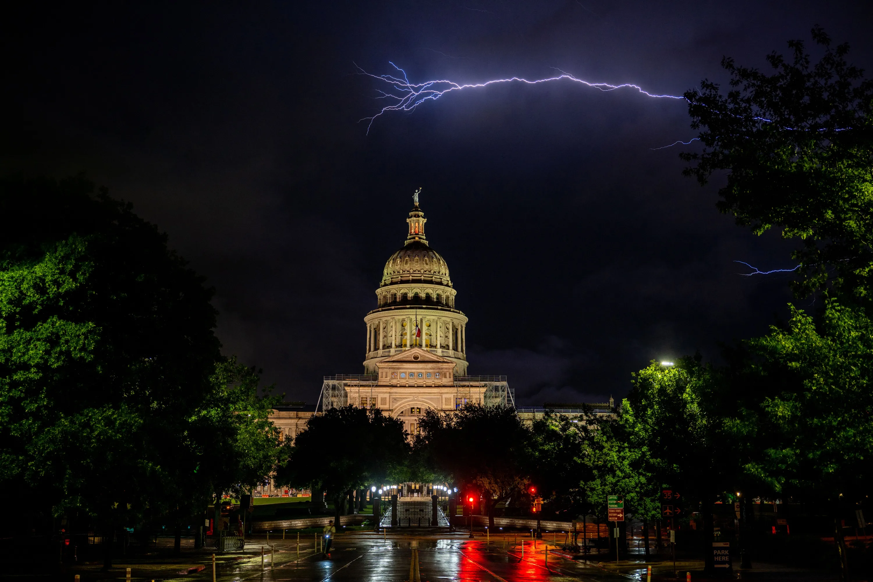 Lightning flashes behind the Texas State Capitol on April 27, 2023 in Austin, Texas. (Photo by Brandon Bell/Getty Images)