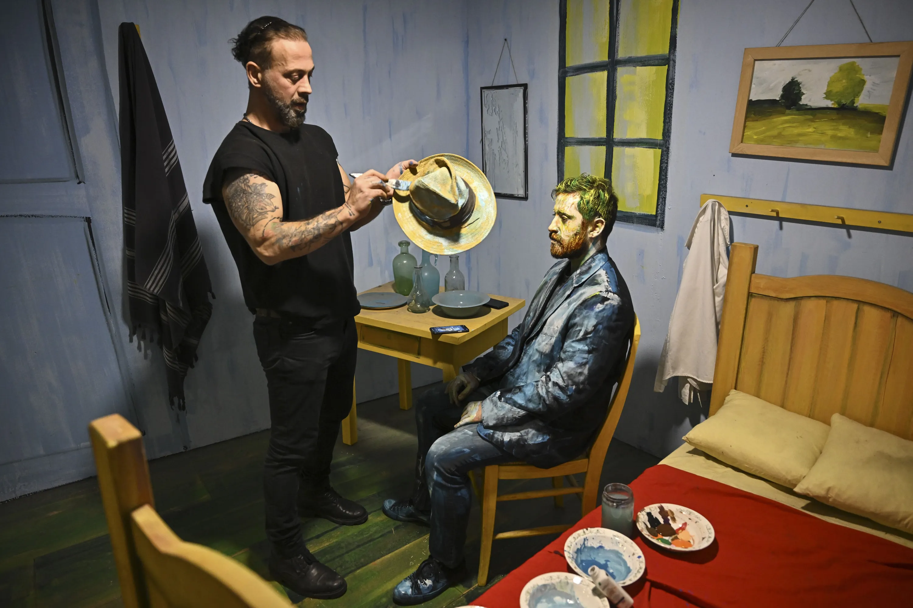 Painter Murat Karabuyuk creates Vincent van Gogh's “Bedroom in Arles” in three-dimensions, and also draws the famous Dutch painter's self-portrait on his student's face with the “human painting” technique in Ankara, Turkiye on October 21, 2023. (Photo by Dogukan Keskinkilic/Anadolu via Getty Images)