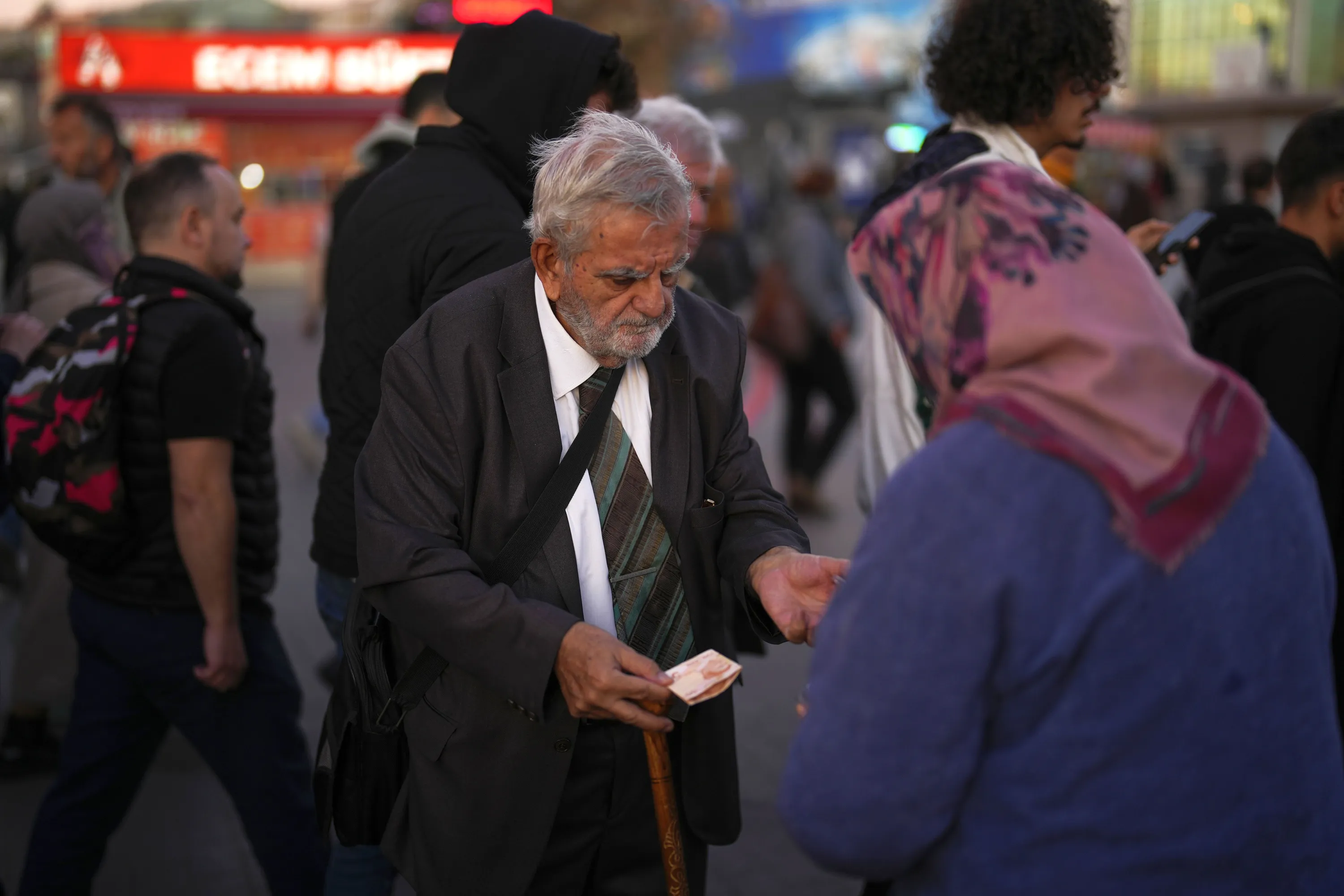 A man purchases food from a street vendor at Kadikoy ferry terminal in Istanbul, Thursday, November 16, 2023. Turkey's central bank delivered another huge interest rate hike on Thursday, Nov. 23, 2023 continuing its effort to curb double-digit inflation that has left households struggling to afford food and other basic goods. (Photo by Francisco Seco/AP Photo)