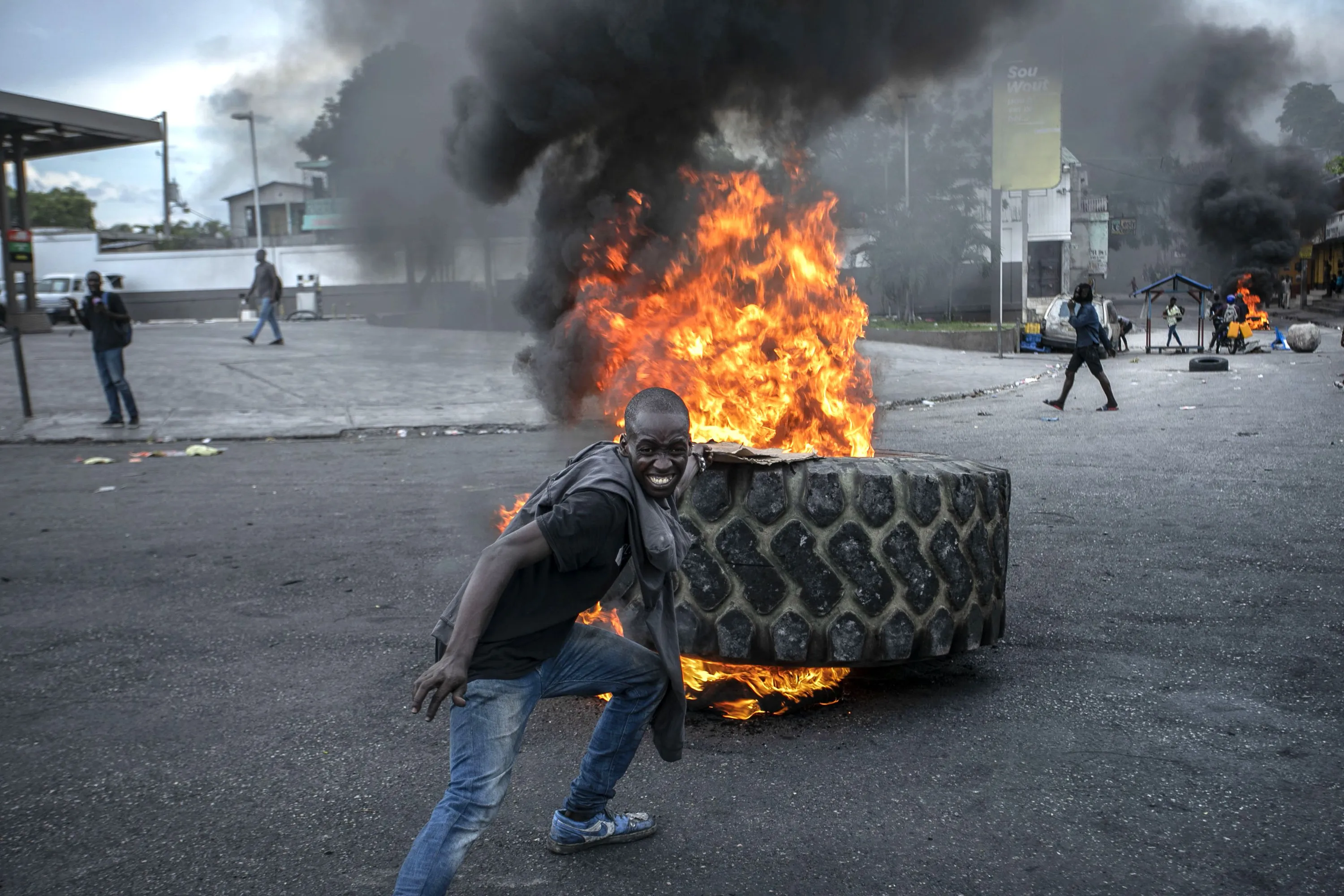 A protester adds a tire to a burning barricade during a protest against fuel price hikes and demands for Haitian Prime Minister Ariel Henry to step down in Port-au-Prince, Haiti, Friday, September 16, 2022. (Photo by Joseph Odelyn/AP Photo)