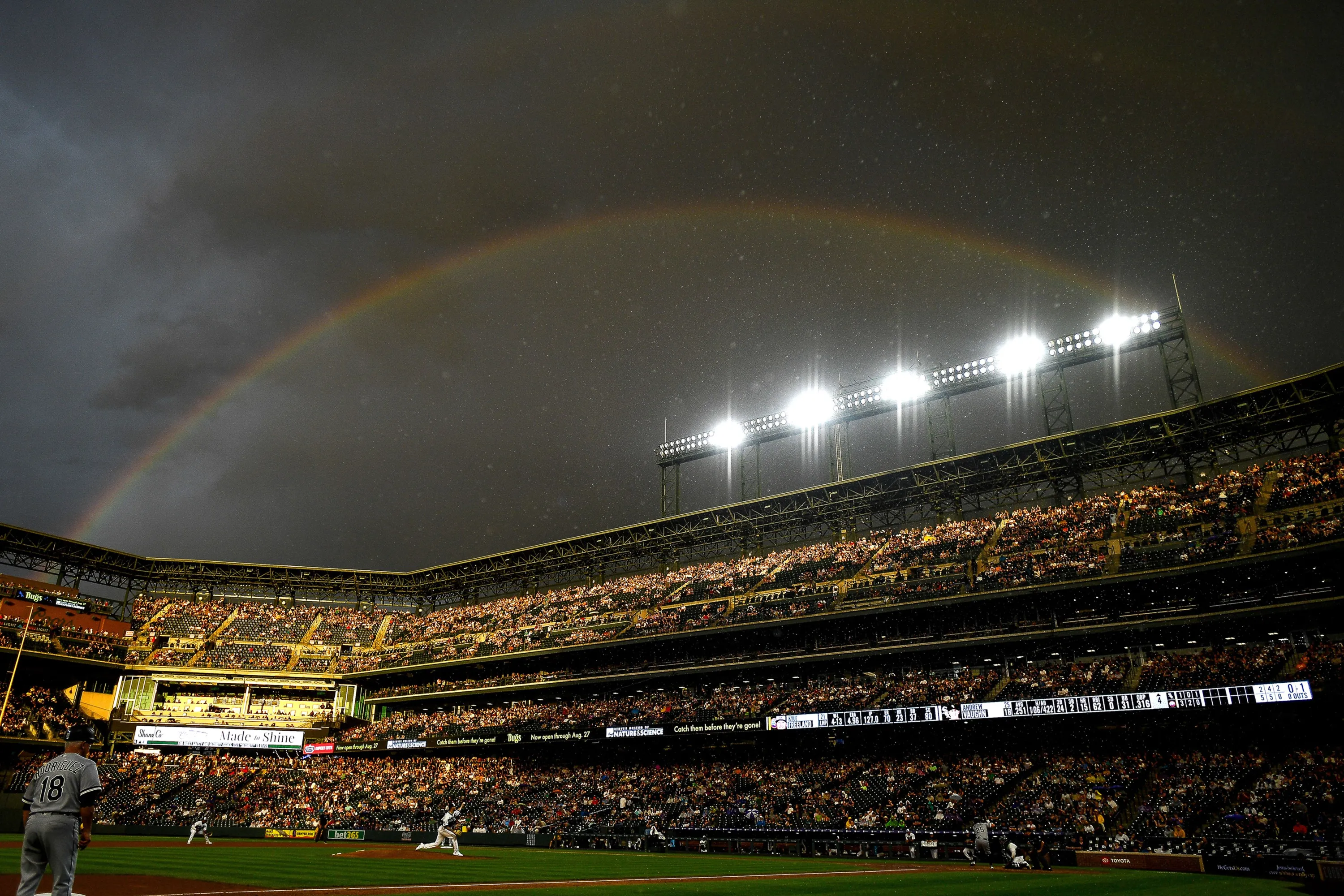 Kyle Freeland #21 of the Colorado Rockies pitches against the Chicago White Sox in the fourth inning in a general view as a rainbow is seen in the stadium at Coors Field on August 19, 2023 in Denver, Colorado. (Photo by Dustin Bradford/Getty Images)
