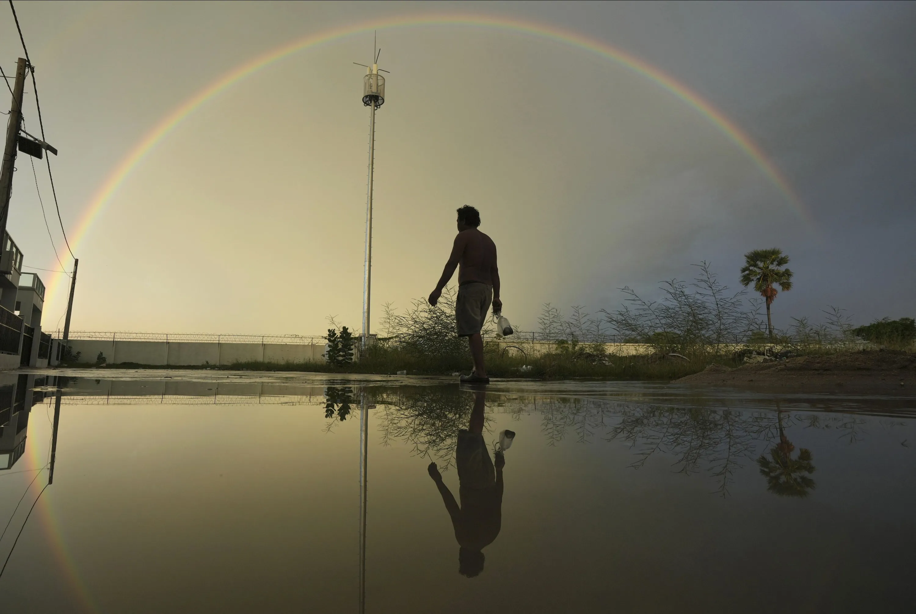 A construction worker walks for catching fish as a rainbow appears over Sre Ampel village on the outskirts of Phnom Penh, Cambodia, Monday, June 19, 2023. (Photo by Heng Sinith/AP Photo)