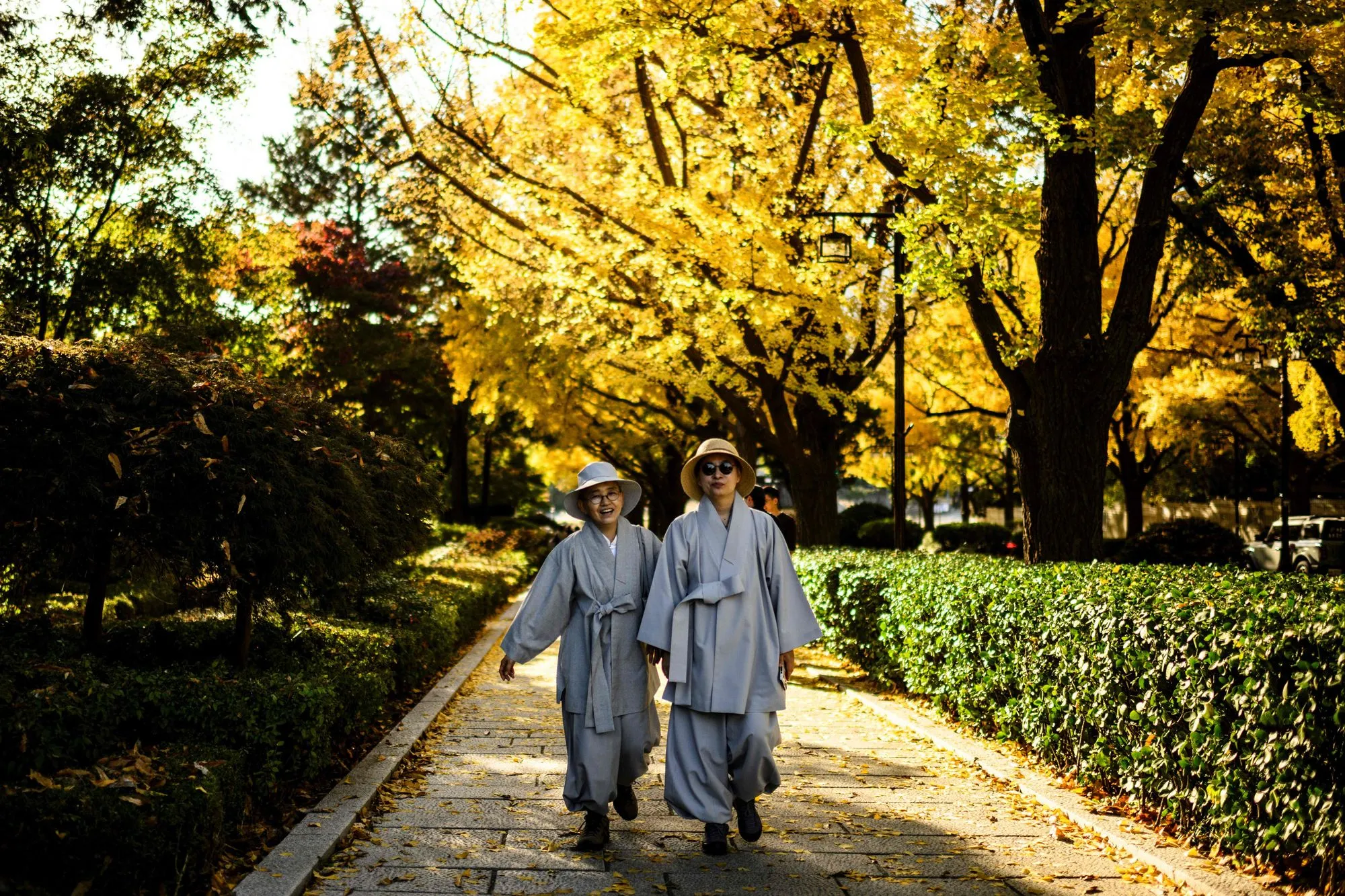 Buddhist nuns walk amongst trees with autumnal foliage in Seoul on November 2, 2023. (Photo by Anthony Wallace/AFP Photo)