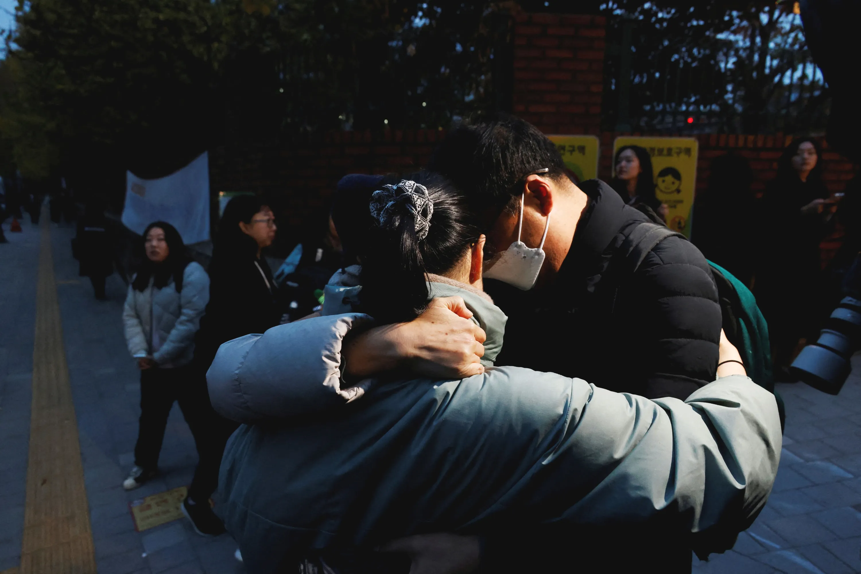 A father hugs her daughter as she takes the College Scholastic Ability Test in Seoul, South Korea on November 15, 2023. (Photo by Kim Soo-hyeon/Reuters)