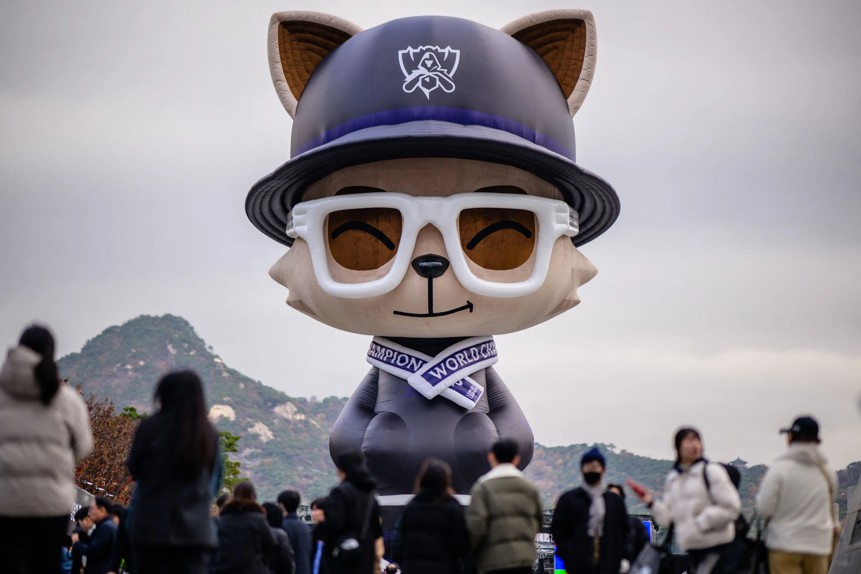 People walk in front of a huge temporarily installed “Teemo” at the “2023 Worlds Fan Fest” for the League of Legends World Championship 2023, also known as LoL Worlds 2023 or Worlds 2023, at Gwanghwamun Square in Seoul on November 17, 2023, ahead of the grand final on November 19. The LoL season will culminate in a best of five match between South Korea's T1 and Chinese team Weibo Gaming at the sold 18,000-seat Gocheok Sky Dome in western Seoul on November 19. (Photo by Anthony Wallace/AFP Photo)