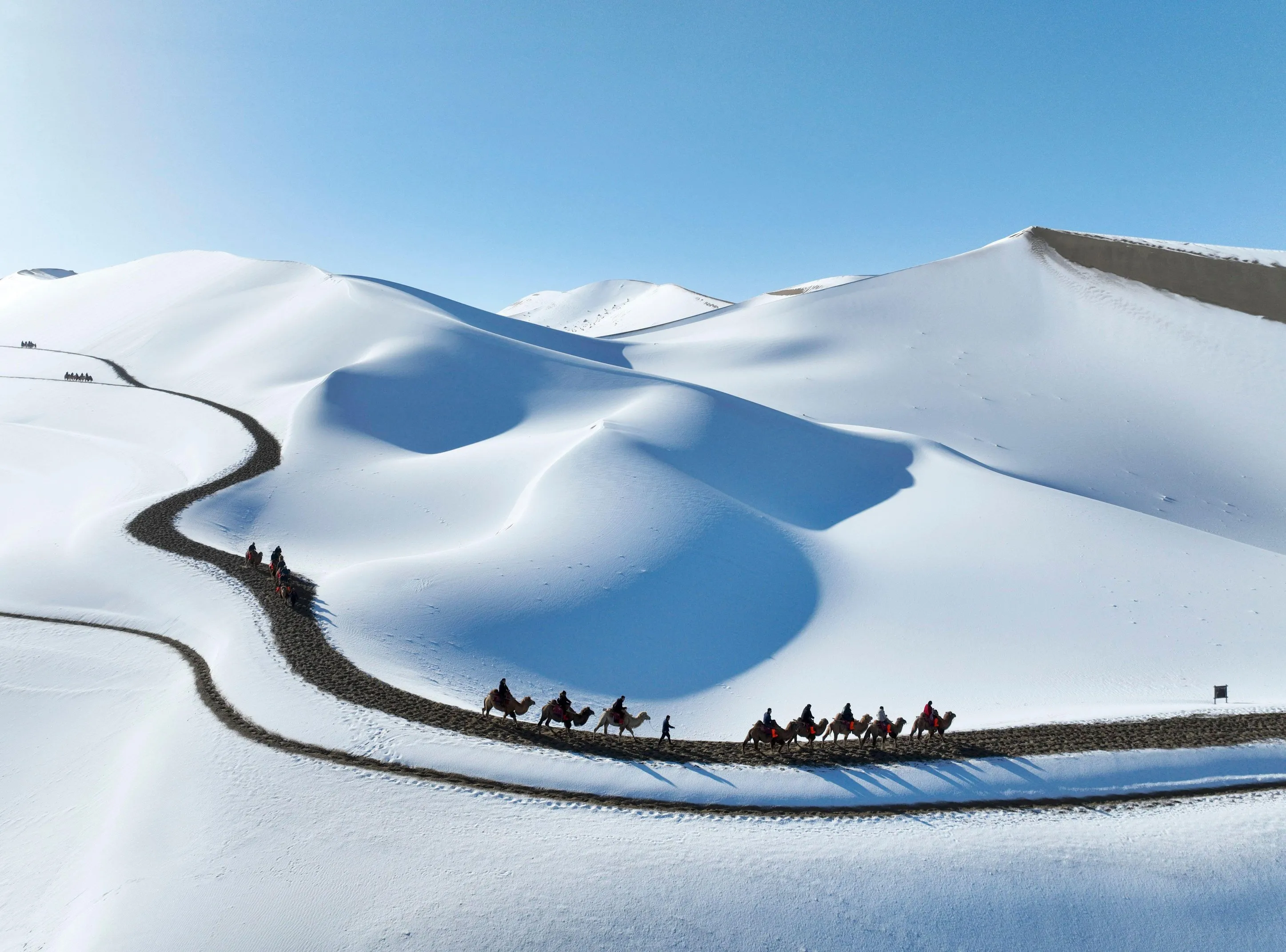 This aerial photo taken on November 15, 2023 shows tourists enjoying snow scenery of the Mingsha Mountain and Crescent Spring scenic spot in Dunhuang, northwest China's Gansu Province. (Photo by Zhang Xiaoliang/Xinhua/Alamy Live News)