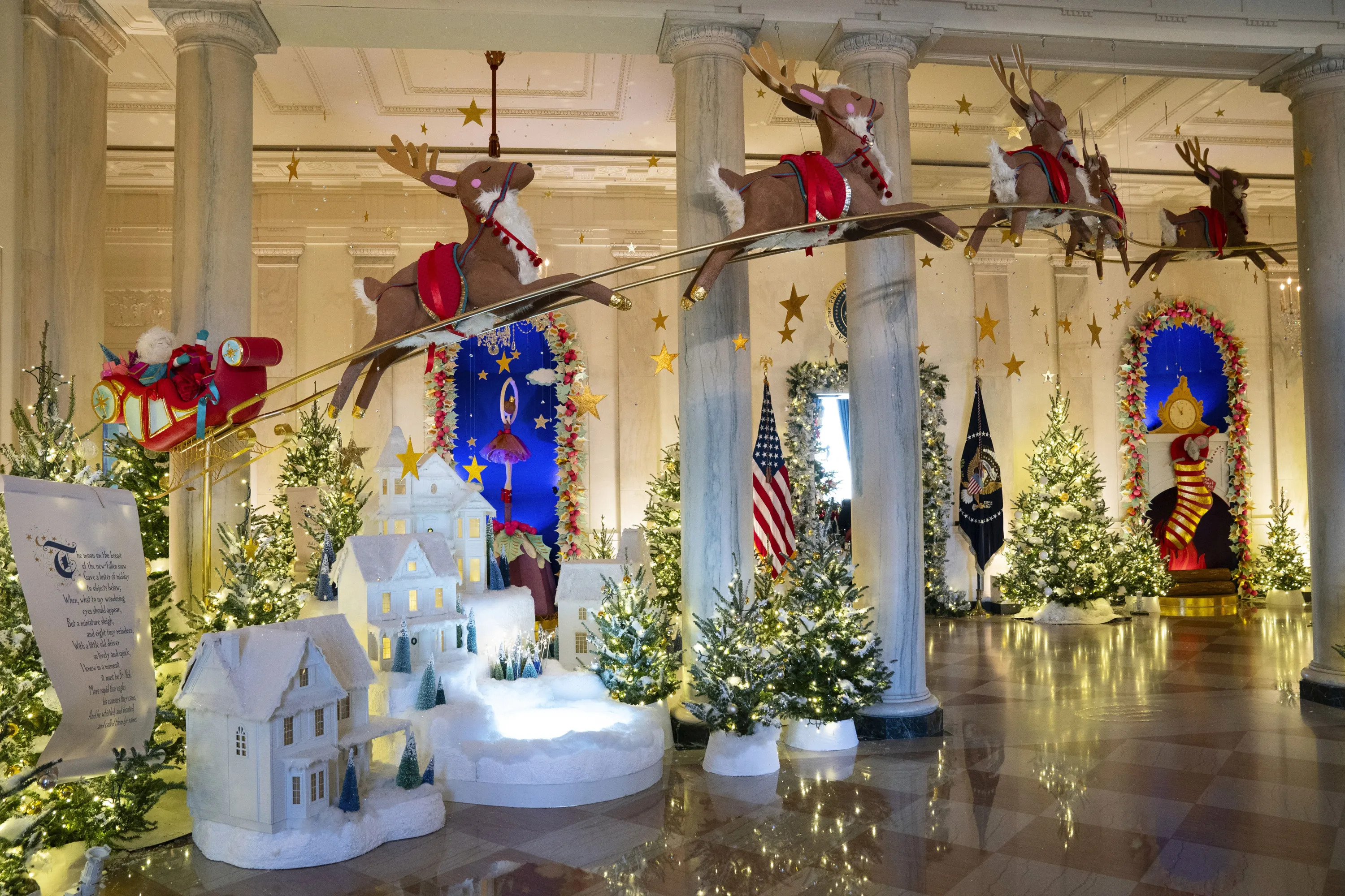 Holiday decorations adorn the Grand Foyer of the White House for the 2023 theme “Magic, Wonder, and Joy”, Monday, November 27, 2023, in Washington. (Photo by Evan Vucci/AP Photo)