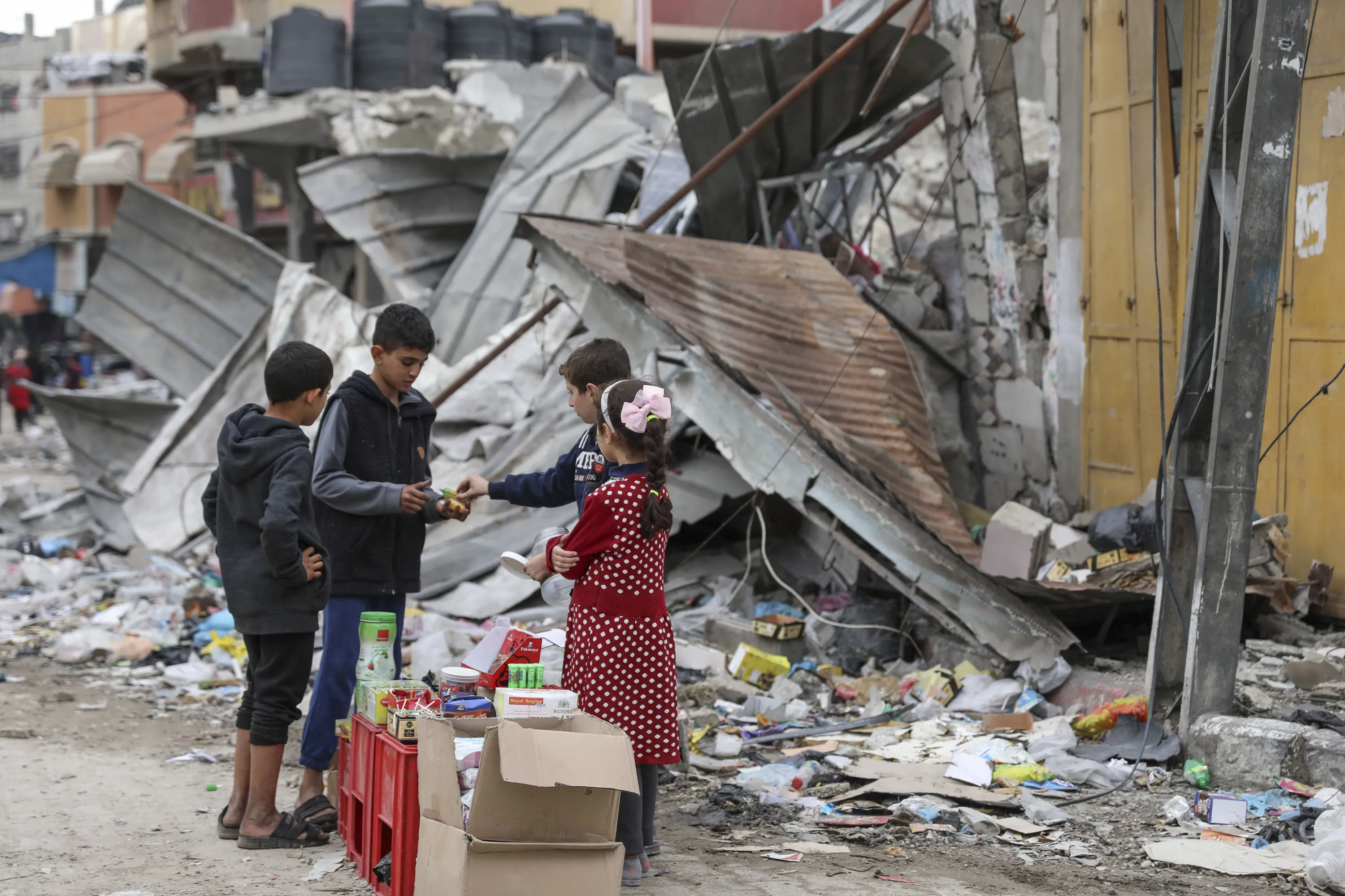 Palestinian children sell sweets in front of the rubble of a destroyed building in Jebaliya refugee camp, Gaza Strip, Tuesday, November 28, 2023, on the fifth day of the temporary ceasefire between Hamas and Israel. (Photo by Mohammed Hajjar/AP Photo)