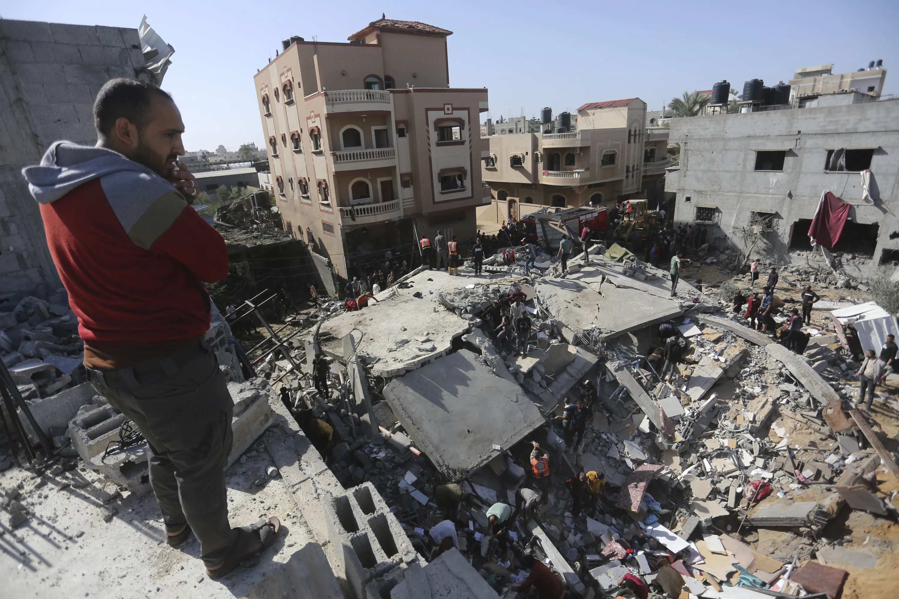 Palestinians look for survivors after an Israeli strike on the Gaza Strip in Rafah on Saturday, November 23, 2023. (Photo by Hatem Ali/AP Photo)