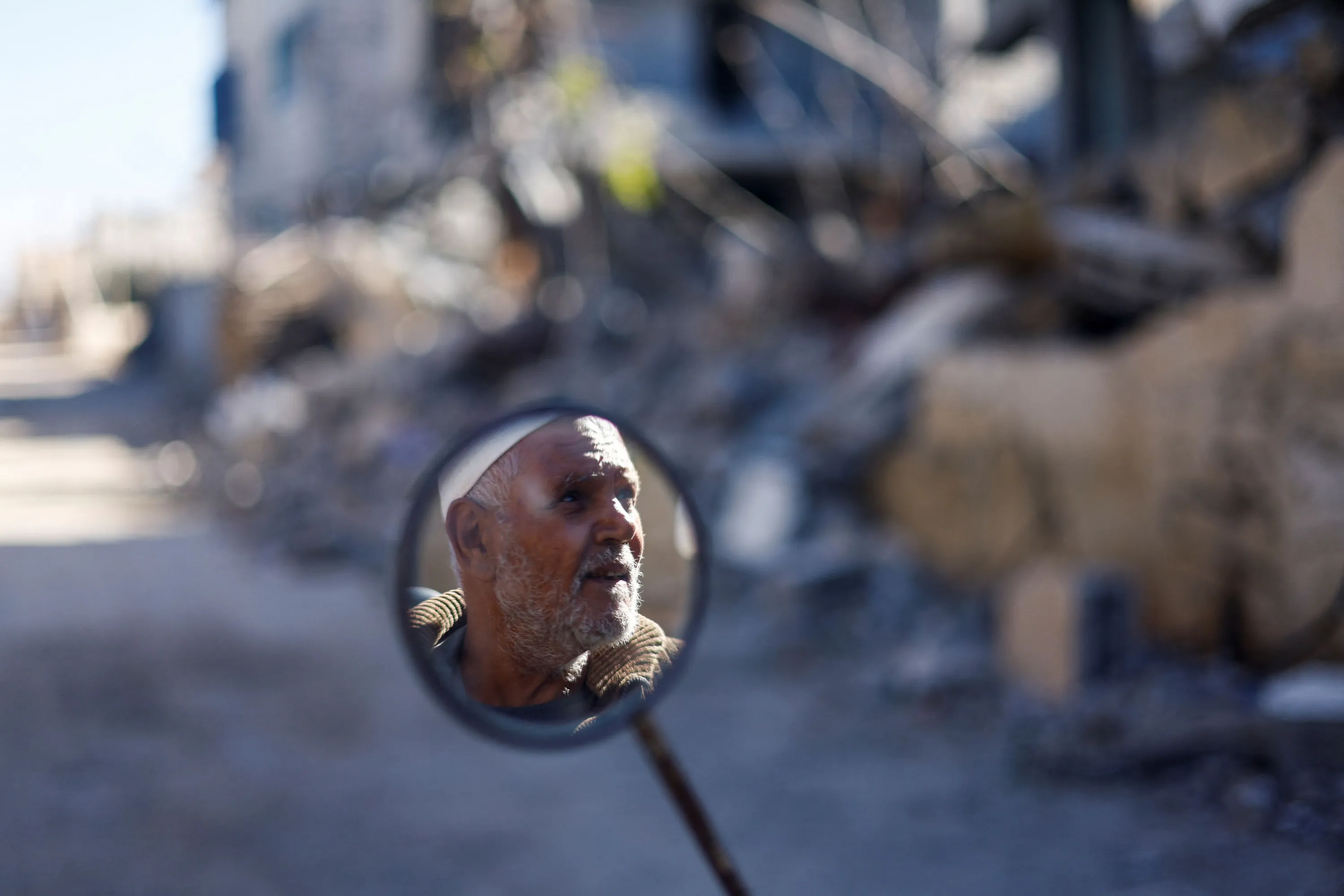 A man's face is reflected in a mirror, near the ruins of houses destroyed in Israeli strikes during the conflict, during a temporary truce between Hamas and Israel, in Khan Younis in the southern Gaza Strip on November 30, 2023. (Photo by Mohammed Salem/Reuters)
