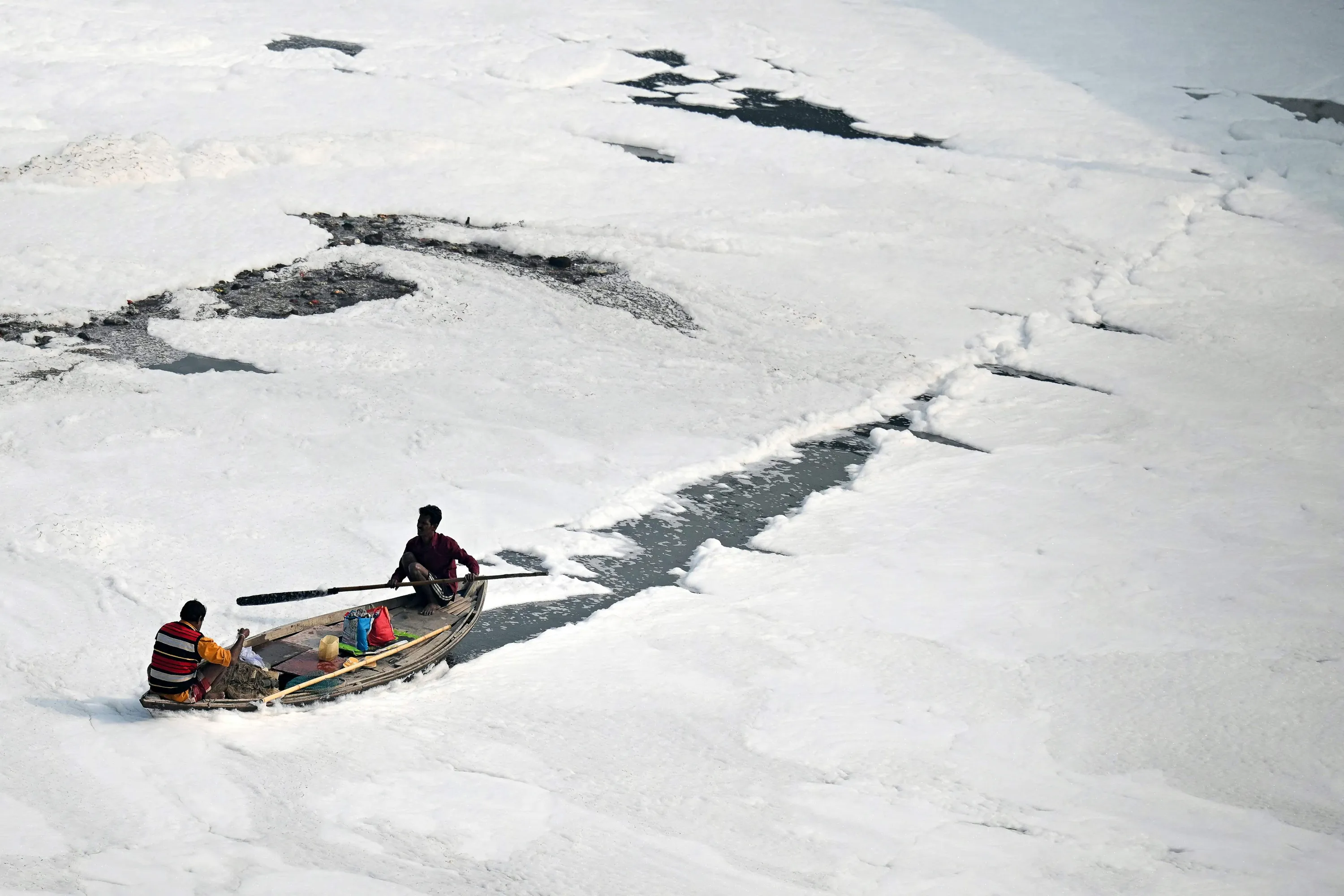 A boatman steers a boat in the polluted waters of the Yamuna River in New Delhi on November 23, 2023. (Photo by Money Sharma/AFP Photo)