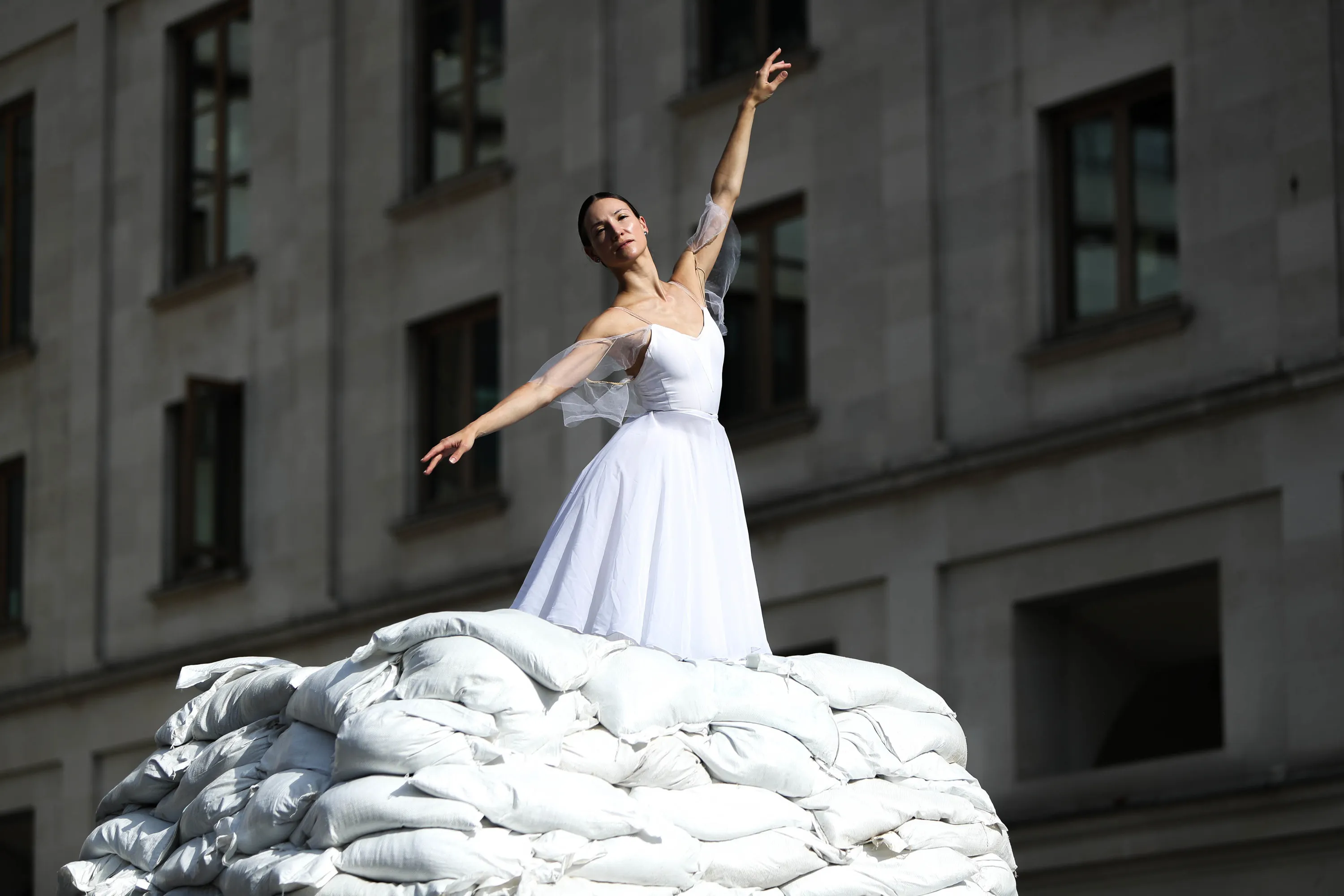 Christine Shevchenko, a Ukrainian-American dancer from Odessa, performs on top of a sandbag art installation entitled 'Defiant Dancer' as a symbol of support towards Ukraine's enduring art and culture scene in Covent Garden, London on Thursday, September 8, 2022. In Ukraine, statues and cultural monuments are entombed in sandbags to ensure their survival against the missiles and bombs of war. (Photo by Kieran Cleeves/PA Wire)