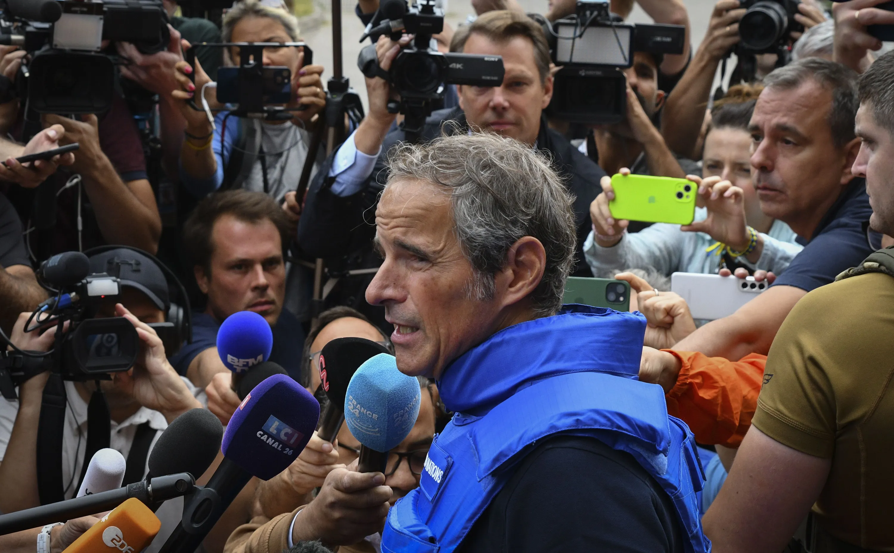 Director General of the International Atomic Energy Agency (IAEA) Rafael Mariano Grossi speaks to the media as a mission of the International Atomic Energy Agency prepare to visit the Zaporizhzhia nuclear power plant, in Zaporizhzhia, Ukraine, Thursday, September 1, 2022. (Photo by Andriy Andriyenko/AP Photo)