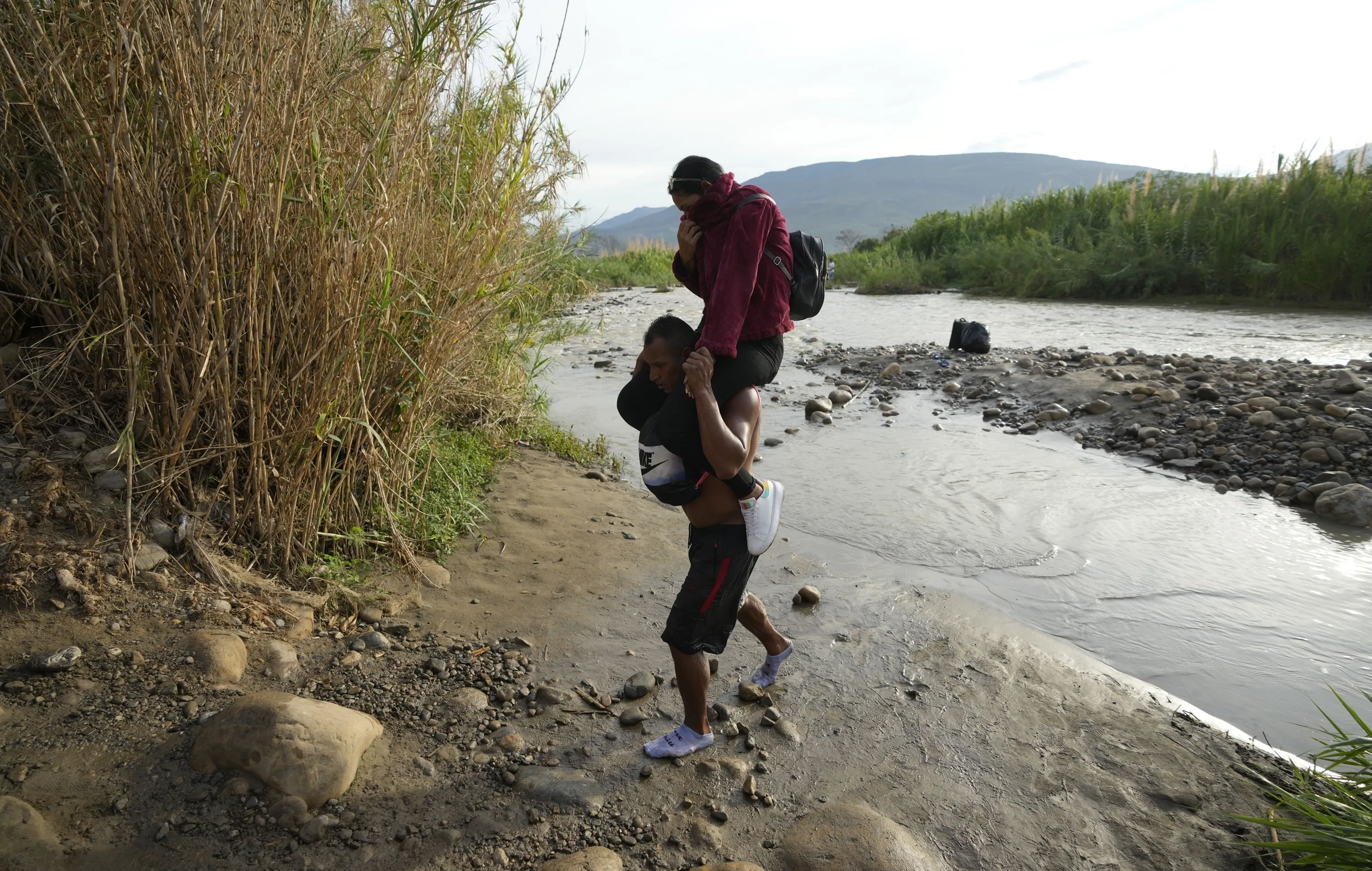 A paid porter carries a person across the Tachira River from Venezuela to Colombia, near Cucuta, Colombia, early Tuesday, September 27, 2022. Some people are still using illegal border crossings despite the Simon Bolivar International Bridge being open to pedestrians, some for reasons like not having identification, and many cross into Colombia to buy goods and then return. (Photo by Fernando Vergara/AP Photo)