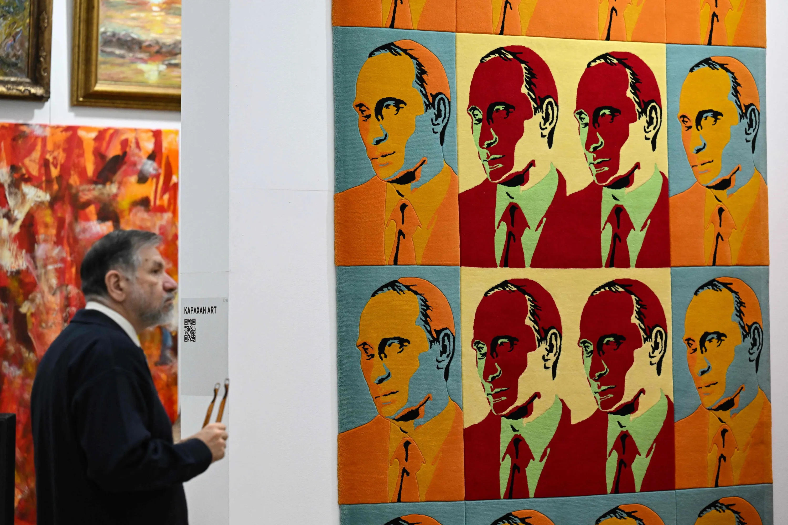 The unique designer carpet depicting Russian President Vladimir Putin in the style of Andy Warhol's iconic portraits made by Russia's designer carpets factory “Imperial-Style” is presented at the annual 49th Russian Antique Salon in Moscow on November 23, 2023. The carpets of the factory, which was founded by Grigory Skvortsov in 1998, decorate the Kremlin halls, state residences, luxury hotels. (Photo by Natalia Kolesnikova/AFP Photo)