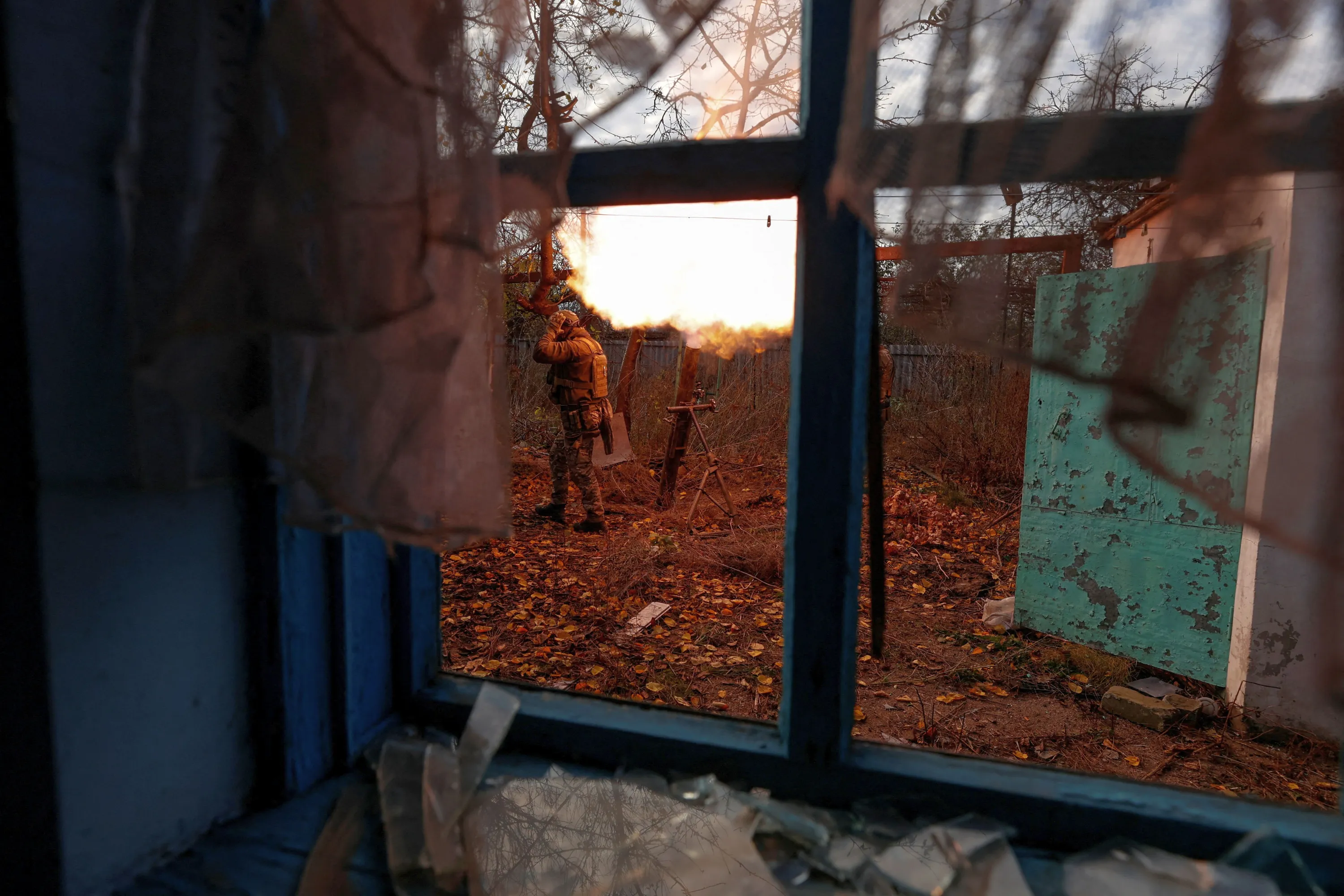 Members of Ukraine's National Guard Omega Special Purpose unit fire a mortar toward Russian troops in the front line town of Avdiivka, amid Russia's attack on Ukraine, in Donetsk region, Ukraine on November 8, 2023. (Photo by Serhiy Nuzhnenko/Radio Free Europe/Radio Liberty)