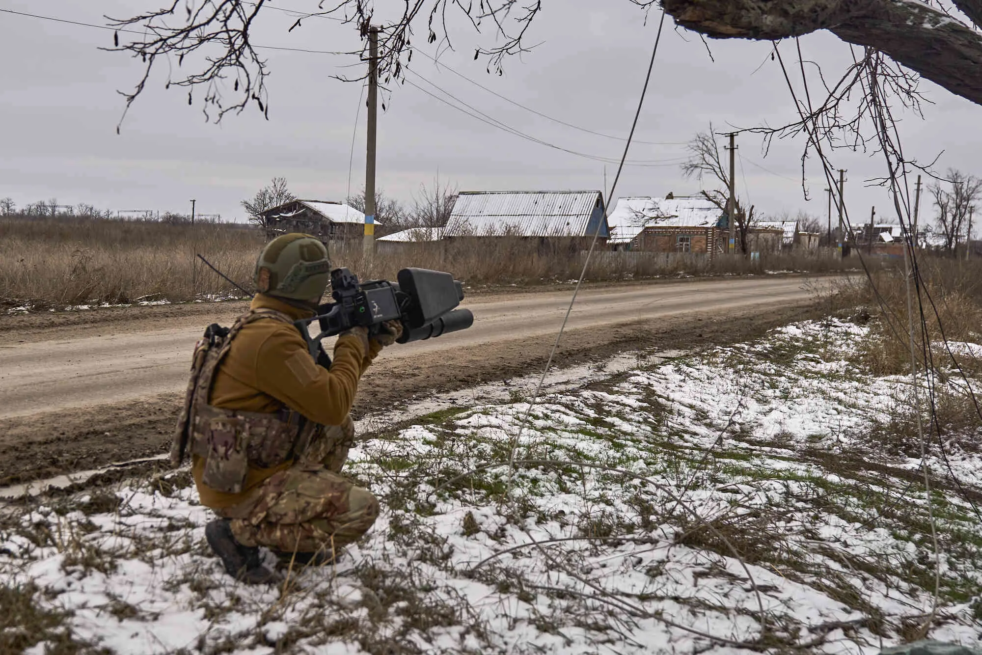 In this photo provided by the Ukrainian 10th Mountain Assault Brigade “Edelweiss”, a Ukrainian soldier holds an anti-drone gun on his position near Bakhmut, Donetsk region, Ukraine, Thursday, November 23, 2023. (Shandyba Mykyta, Ukrainian 10th Mountain Assault Brigade “Edelweiss” via AP)