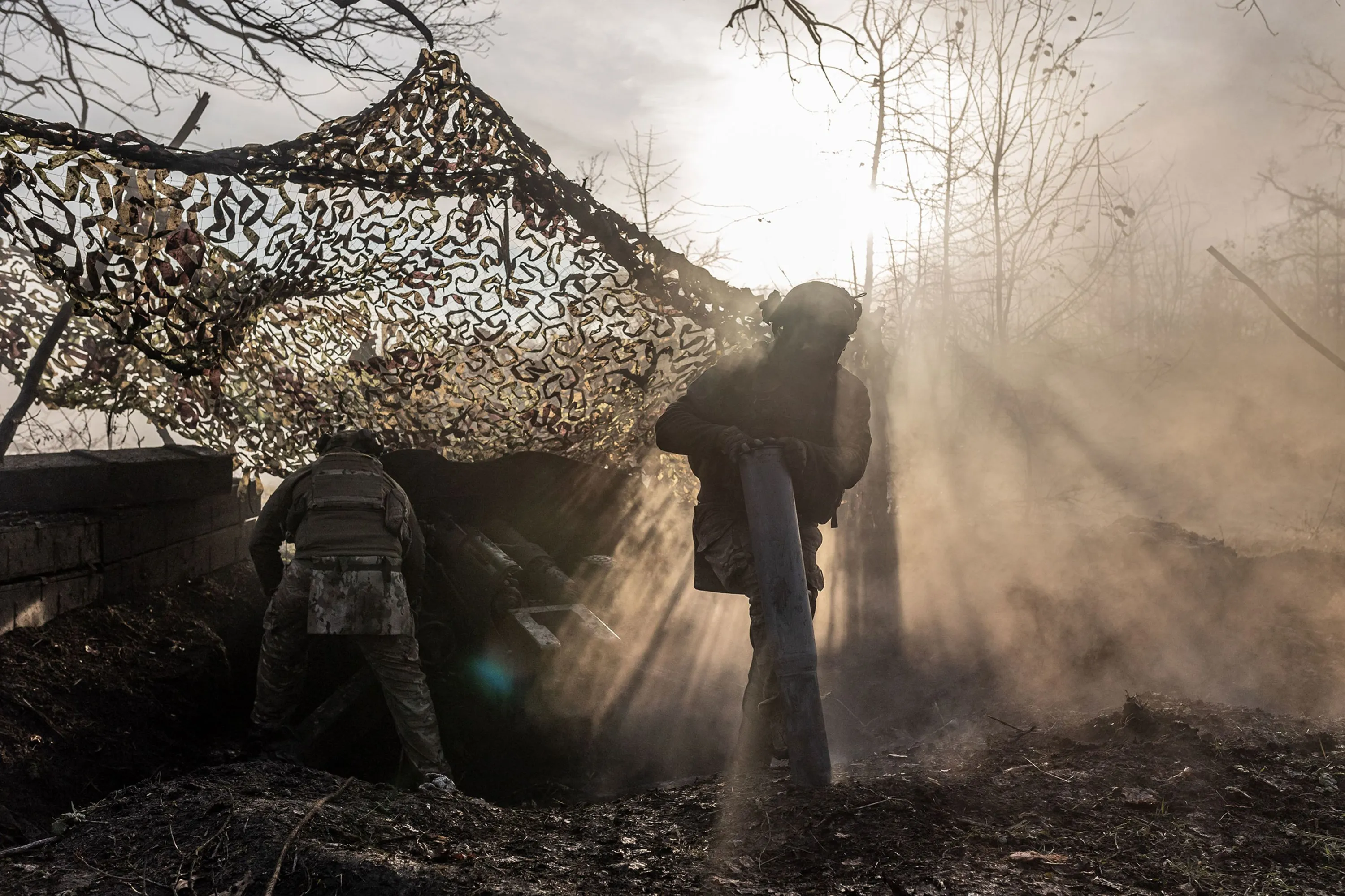 Ukrainian soldiers collect the remains of artillery shells at their fighting position in the direction of Bakhmut as the Russia-Ukraine war continues in Donetsk Oblast, Ukraine on November 11, 2023. (Photo by Diego Herrera Carcedo/Anadolu via Getty Images)