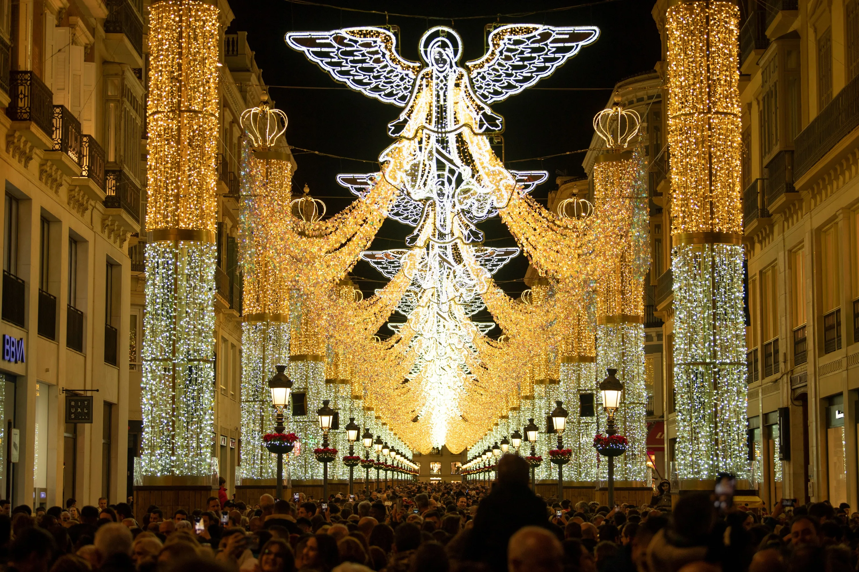 People observe the Christmas lights on Larios street in Malaga on December 2, 2023. (Photo by Jorge Guerrero/AFP Photo)