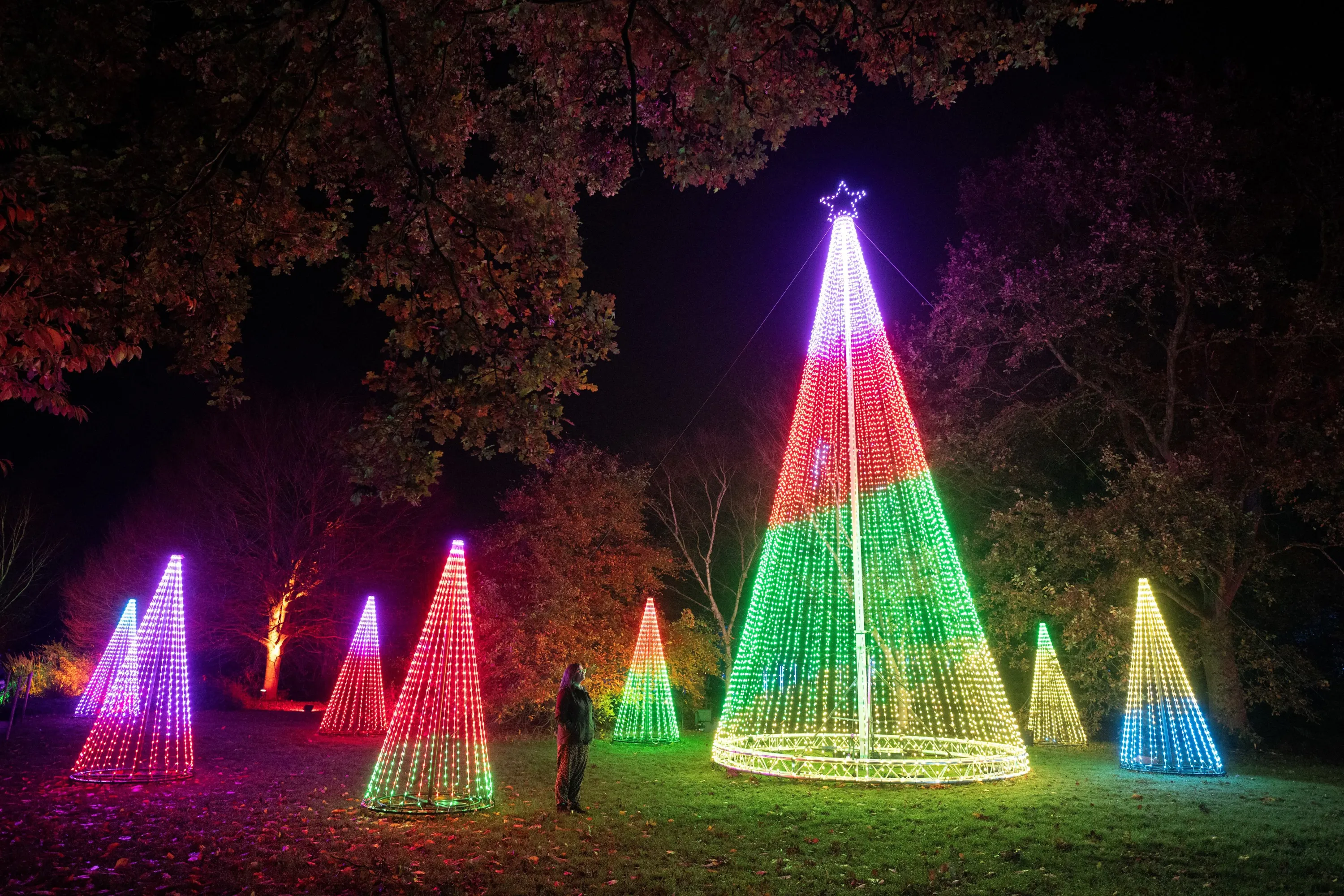 National Trust employee Victoria Emms experiences an artwork entitled “Pixel Trees” on the “Christmas at Dunham Massey” festive light art trail at the National Trust property near Altrincham, northeast England, on November 16, 2023. Dunham Massey, a historic stately home surrounded by gardens and a 300-acre deer park, is hosting their seventh annual Christmas light trail through the gardens which runs until New Year's Eve. (Photo by Oli Scarff/AFP Photo)
