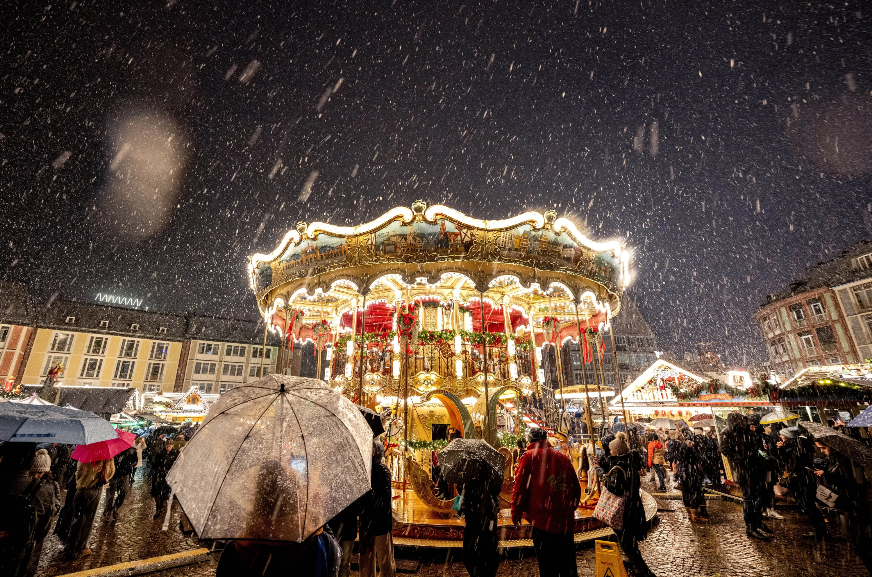Snow falls as the traditional Christmas market with the merry-go-round was opened in Frankfurt, Germany, Monday, November 27, 2023. (Photo by Michael Probst/AP Photo)