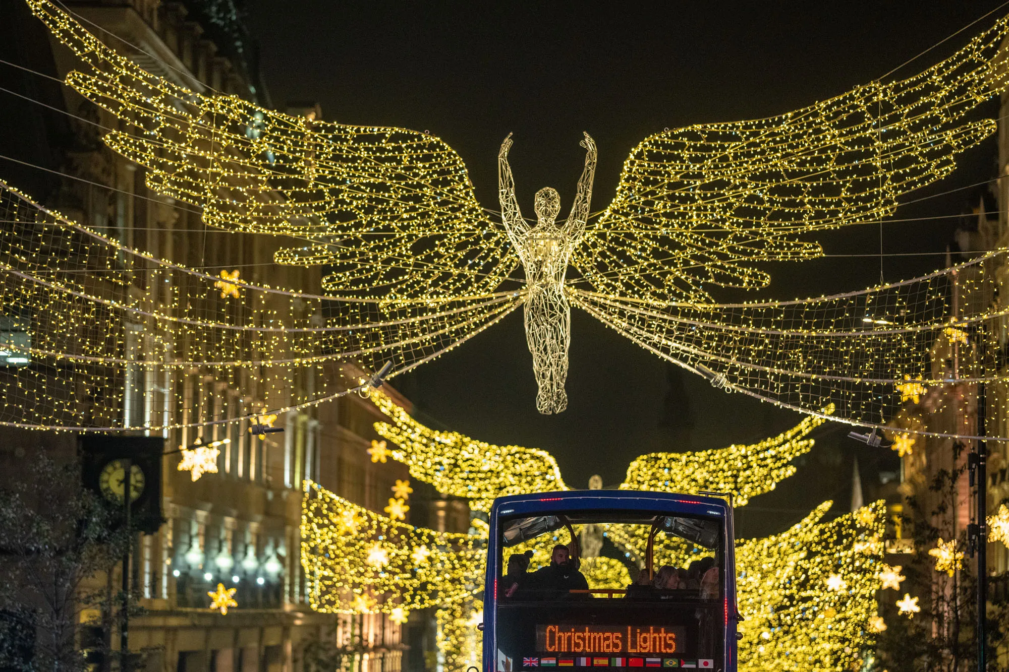 Christmas lights are displayed along Regent Street on November 16, 2023 in London, England. Oxford Street took the lead in the seasonal light display with Lionesses star and Chelsea captain Millie Bright on November 2. (Photo by Carl Court/Getty Images)