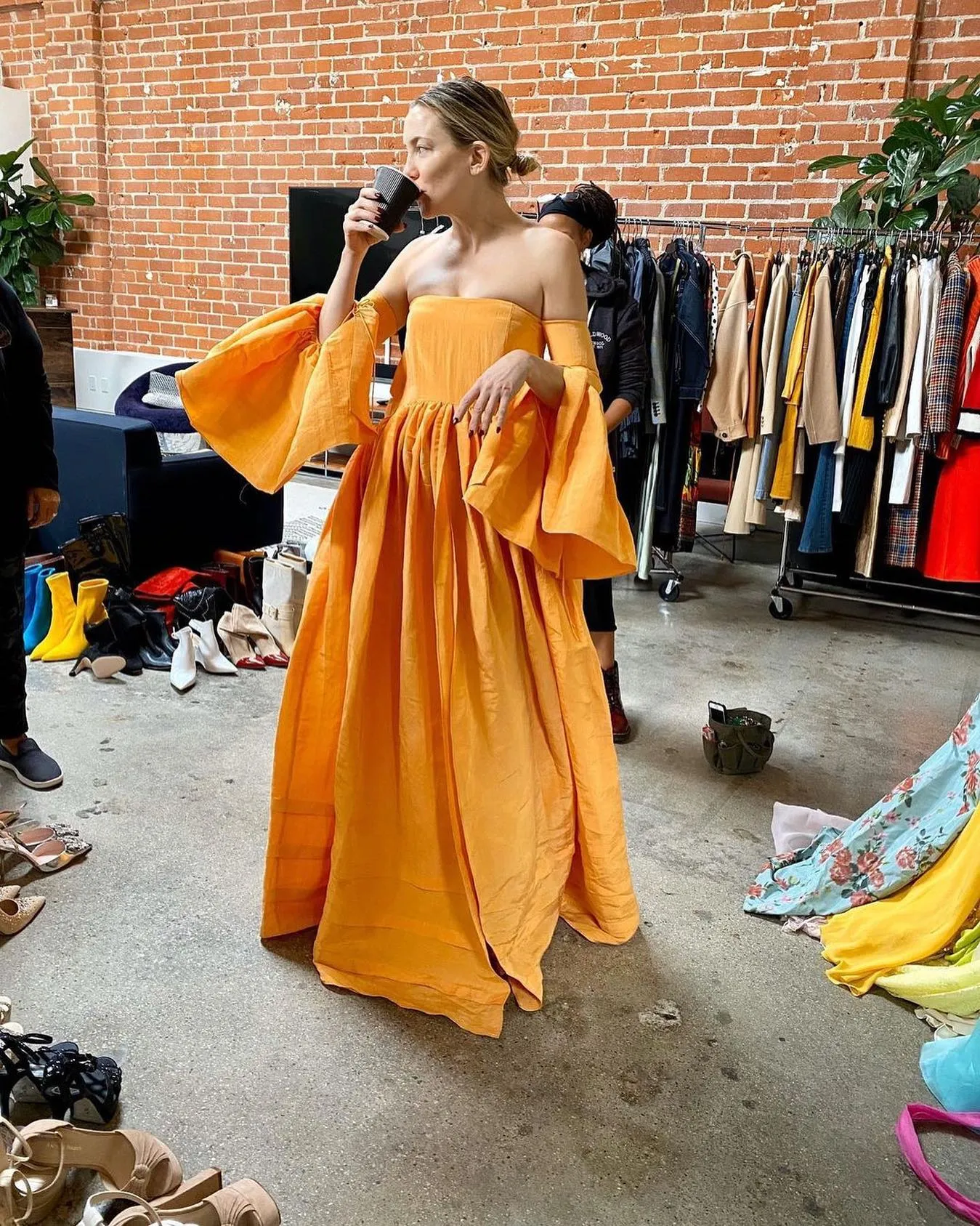 American actress Kate Hudson enjoys a cup of coffee at a fashion fitting in the second decade of November 2023. (Photo by Katehudson/Instagram)