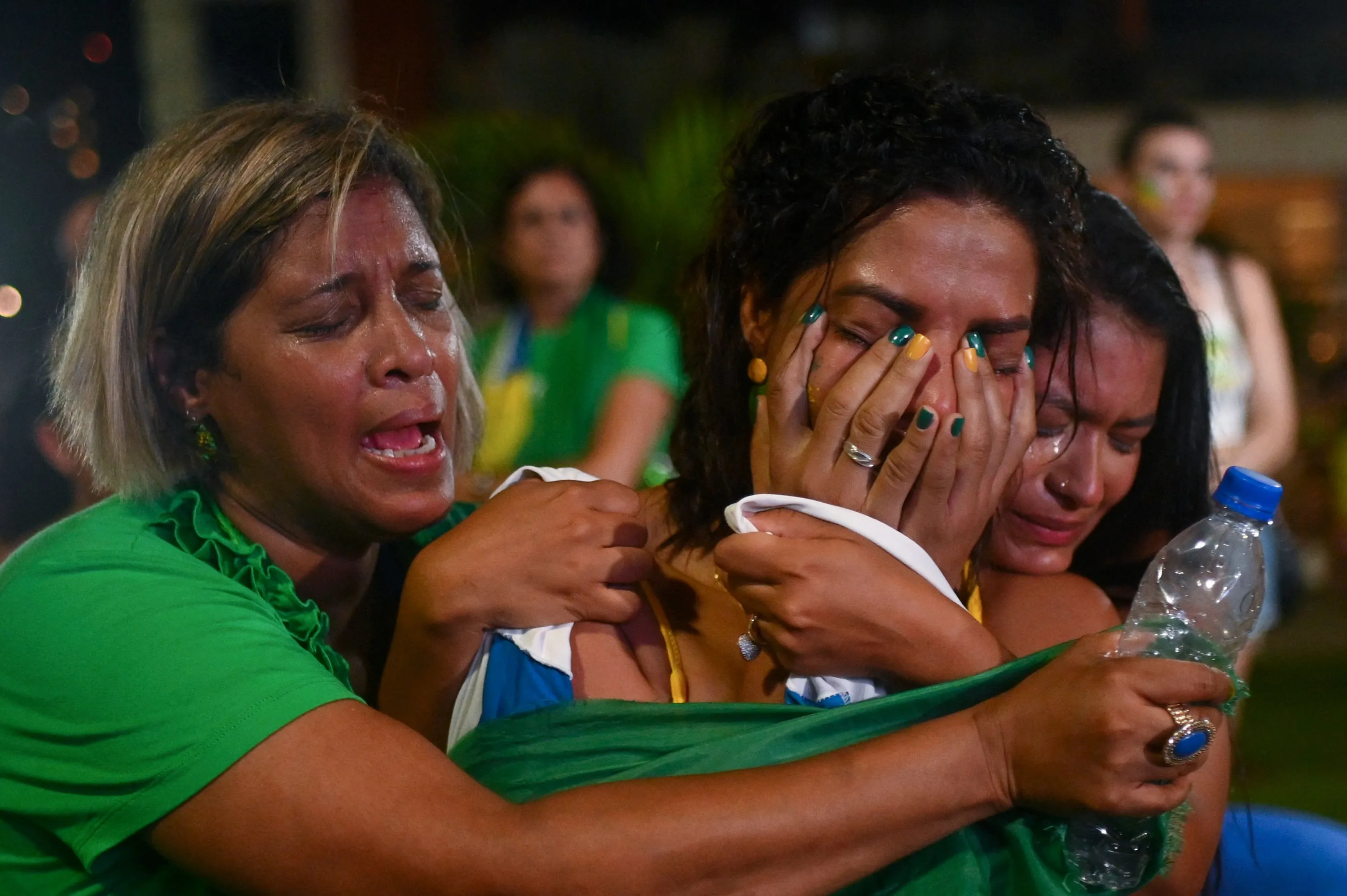 Supporters of Brazilian President and re-election candidate Jair Bolsonaro react after their candidate lost the presidential runoff election in Rio de Janeiro, Brazil, on October 30, 2022. Brazil's veteran leftist Luiz Inacio Lula da Silva was elected president Sunday by a hair's breadth, beating his far-right rival in a down-to-the-wire poll that split the country in two, election officials said. (Photo by Andre Borges/AFP Photo)