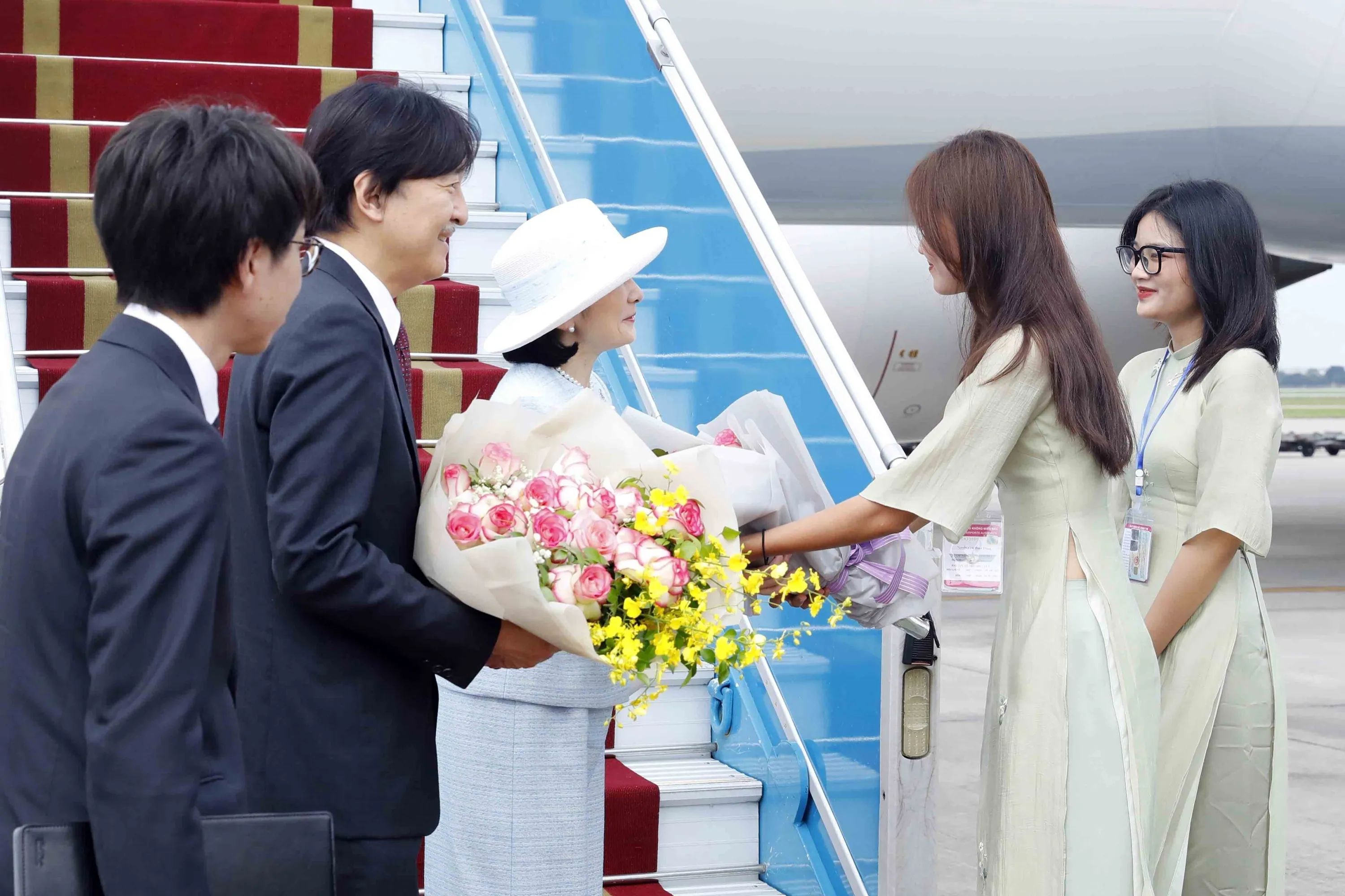 Japanese Crown Prince Akishino, second left, and Crown Princess Kiko, third left, receive flowers from Vietnamese officials after landing in Hanoi, Vietnam Wednesday, September 20, 2023. They are on a visit to Vietnam to mark the 50th anniversary of the diplomatic relation between the two countries. (Photo by An Van Dang/VNA via AP Photo)