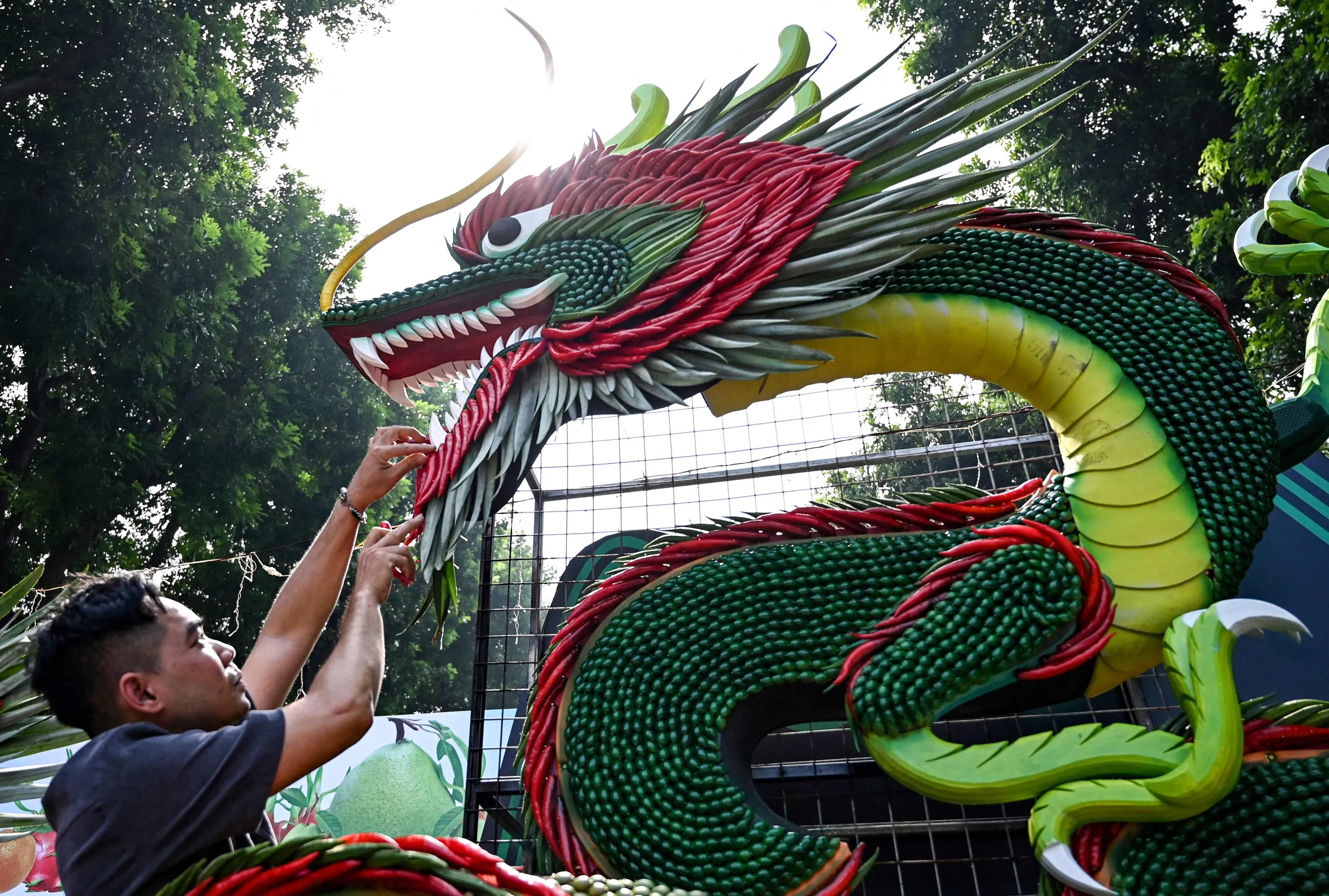 A worker arranges chili peppers on a dragon decoration made with vegetable during the Hanoi Fruit Festival at Thong Nhat park in Hanoi on November 8, 2023. (Photo by Nhac Nguyen/AFP Photo)