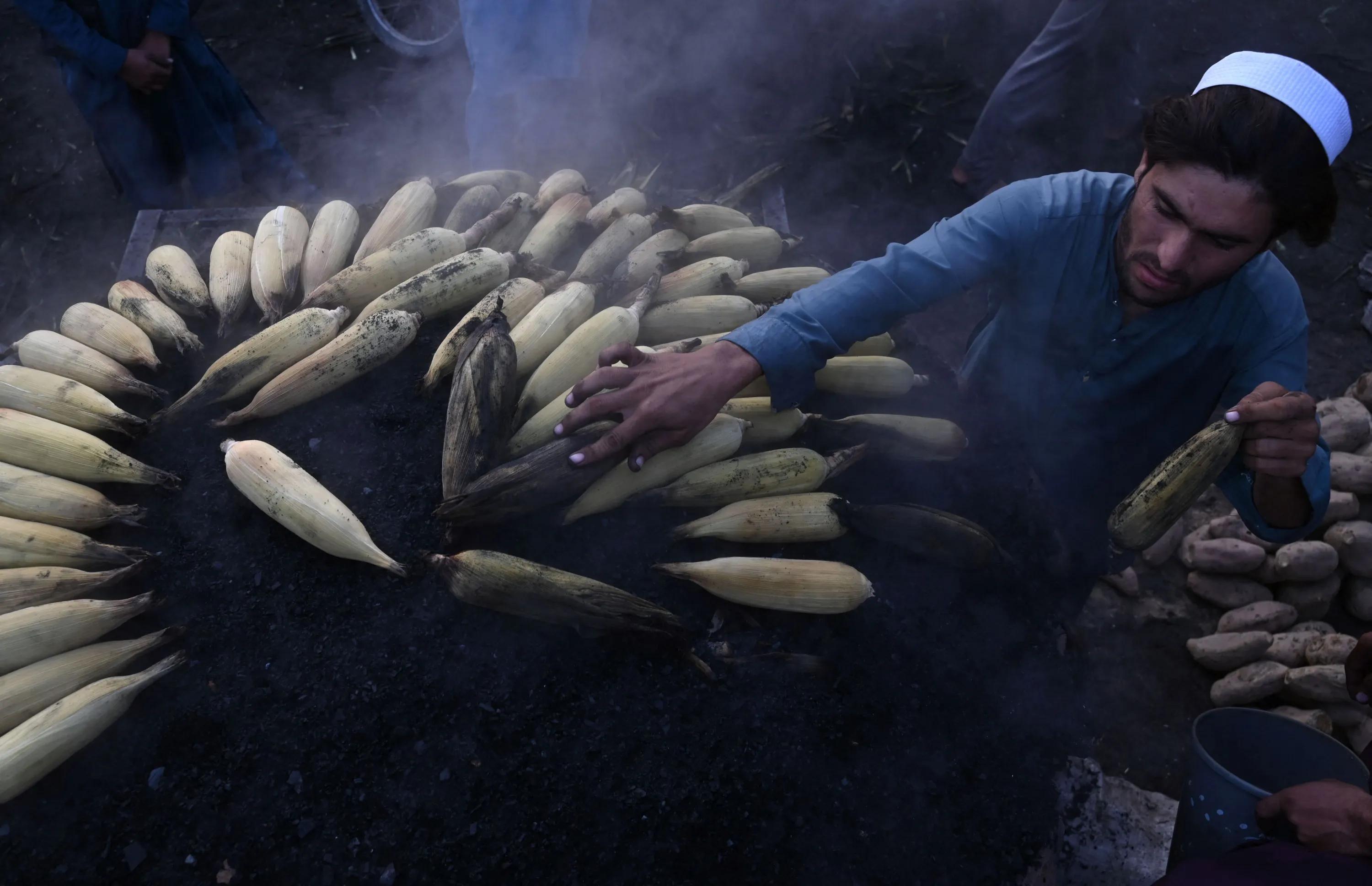 A Pakistani vendor prepares to load roasted corn onto carts in Lahore on October 27, 2023. (Photo by Arif Ali/AFP Photo)