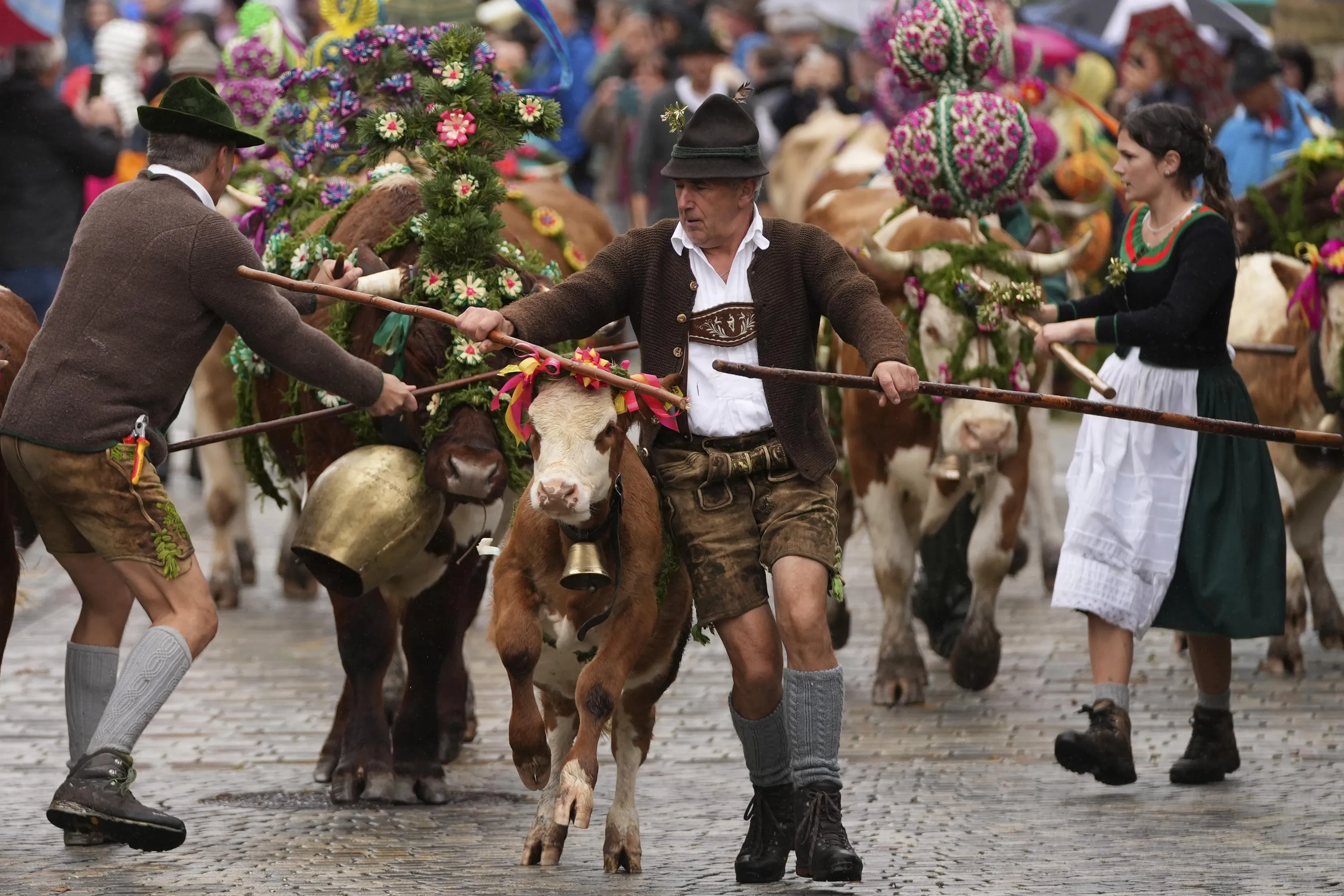 Bavarian mountain farmers pass the chapel of St. Bartholomae on lake Koenigssee while returning their cattle from summer pastures near Berchtesgaden, Germany, Sunday, October 2, 2022. (Photo by Matthias Schrader/AP Photo)