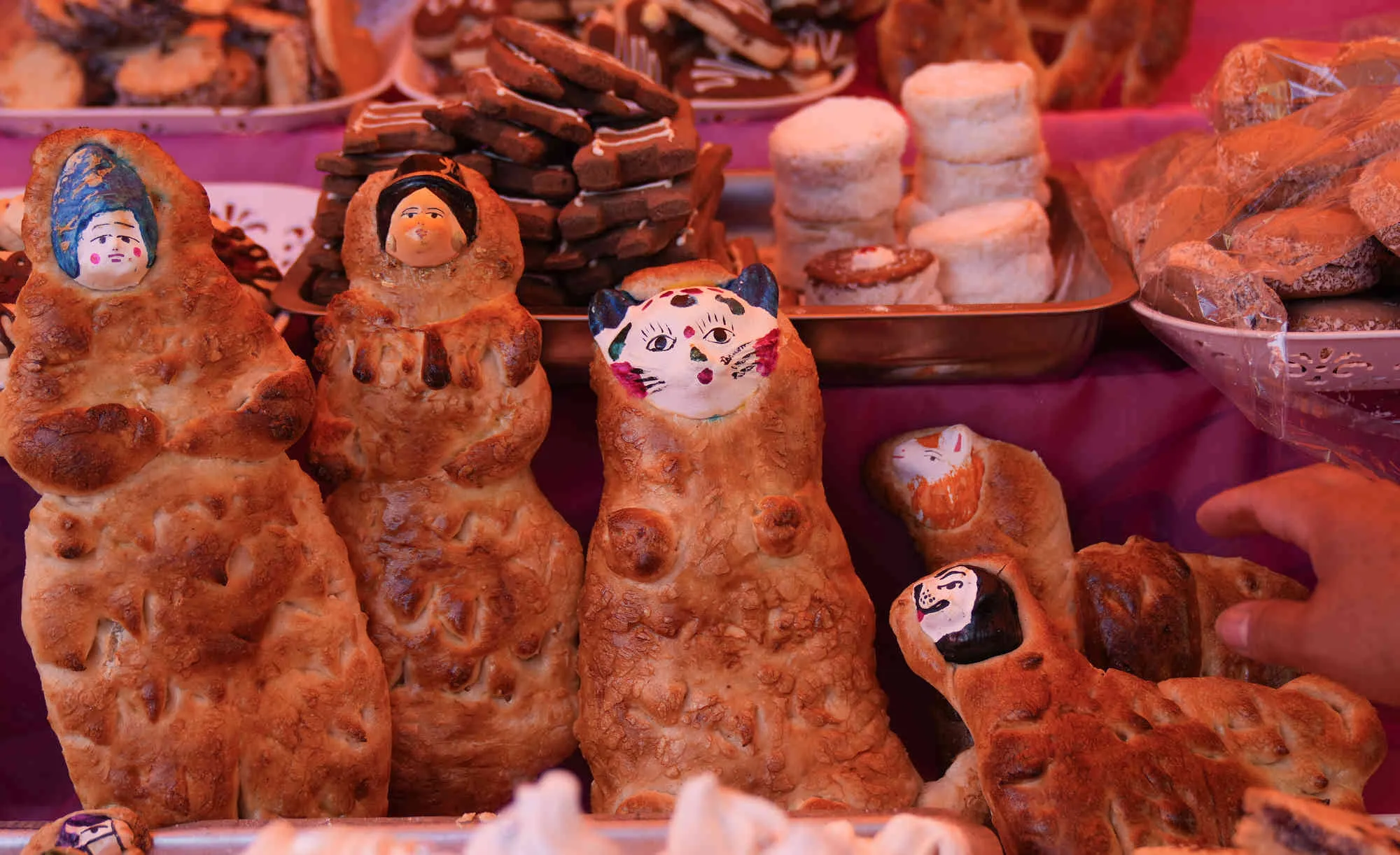A woman sells the traditional Tantawawas, a bread shaped as cholitas and cats offered to the dearly departed on the Day of the Dead, at the street market in La Paz, Bolivia, Monday, October 31, 2022. (Photo by Juan Karita/AP Photo)