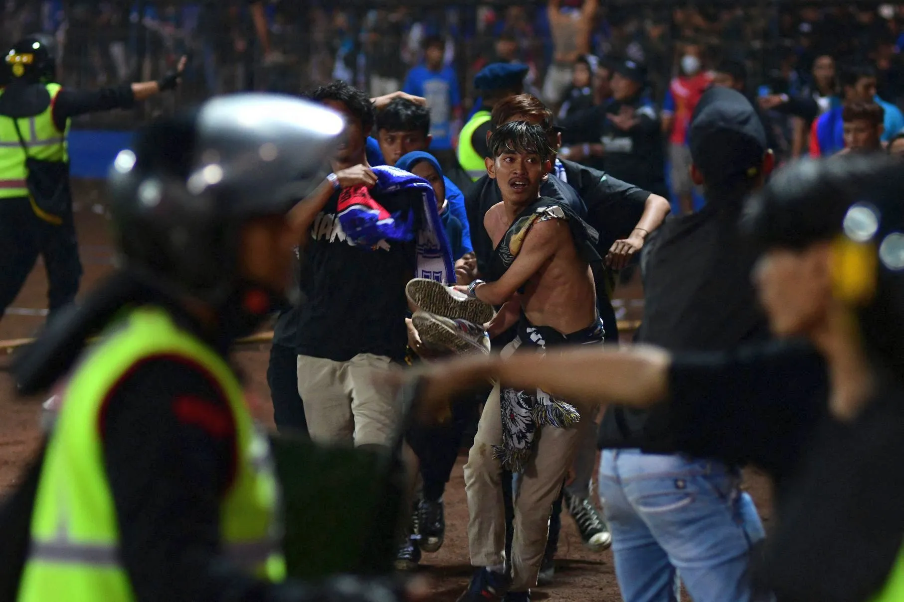 In this picture taken on October 1, 2022, a group of people carry a man after a football match between Arema FC and Persebaya Surabaya at Kanjuruhan stadium in Malang, East Java. At least 127 people died at a football stadium in Indonesia late on October 1 when fans invaded the pitch and police responded with tear gas, triggering a stampede, officials said. (Photo by AFP Photo/Stringer)