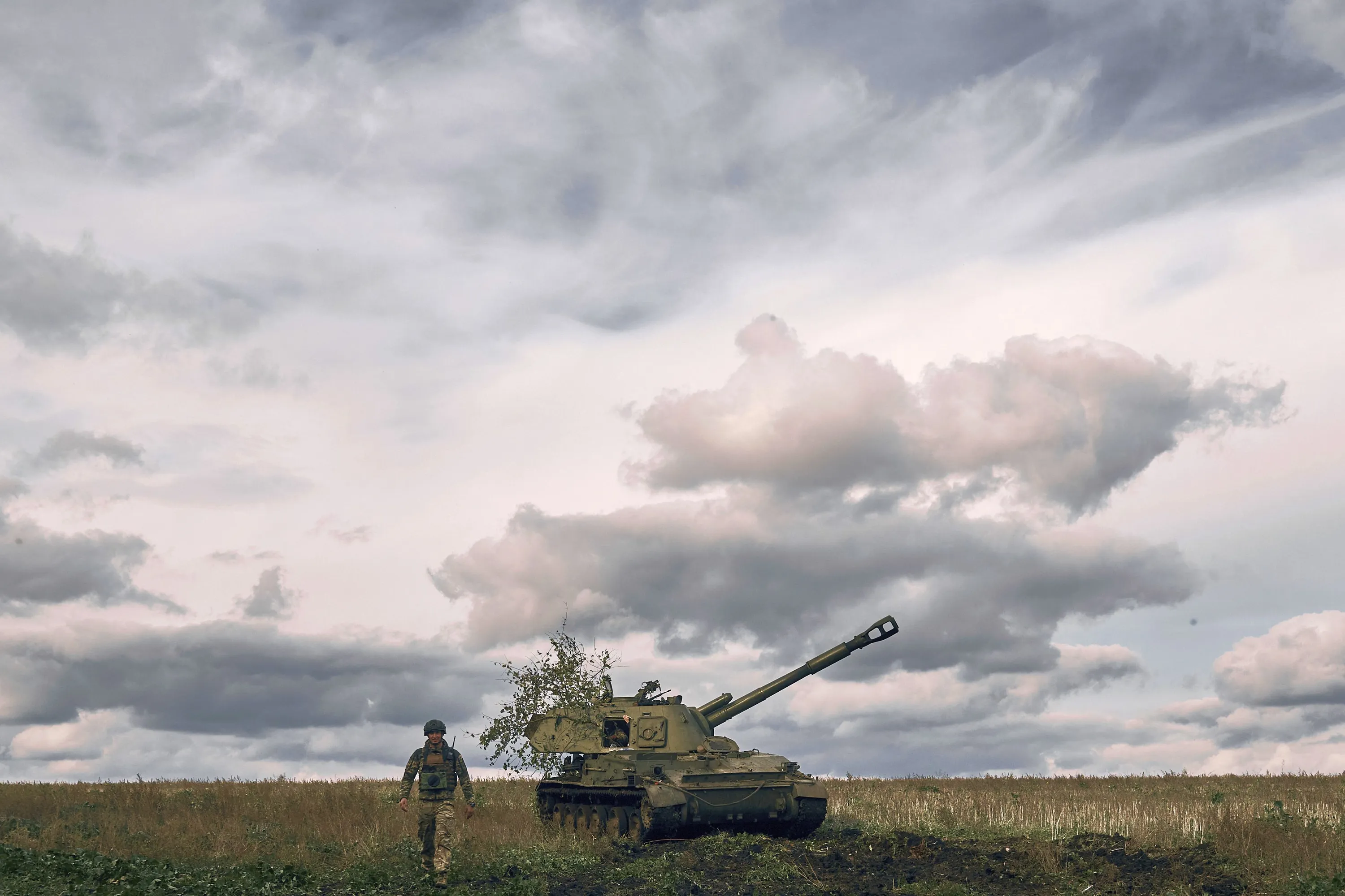 A Ukrainian serviceman walks near a self-propelled artillery vehicle near Bakhmut, Donetsk region, Ukraine, Saturday, October 22, 2022. (Photo by LIBKOS/AP Photo)