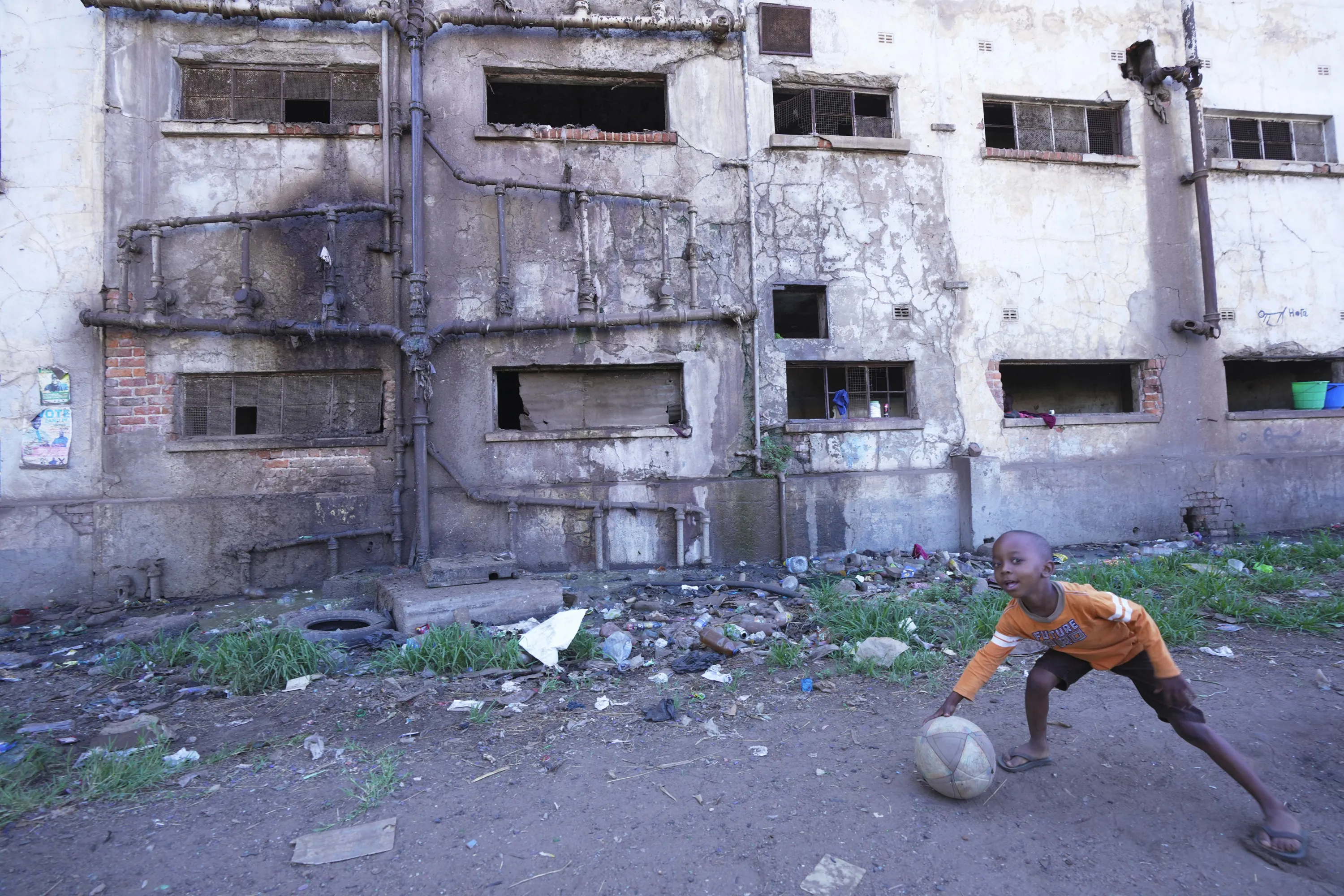 A young boy plays with a ball outside a blocked sewer drain in Harare, Zimbabwe, Saturday November 18, 2023. Zimbabwe is battling a cholera outbreak that has resulted in more than 150 suspected deaths countrywide. Health experts, authorities and residents blame the outbreak on acute water shortages and lack of access to sanitation and hygiene services (Photo by Tsvangirayi Mukwazhi/AP Photo)