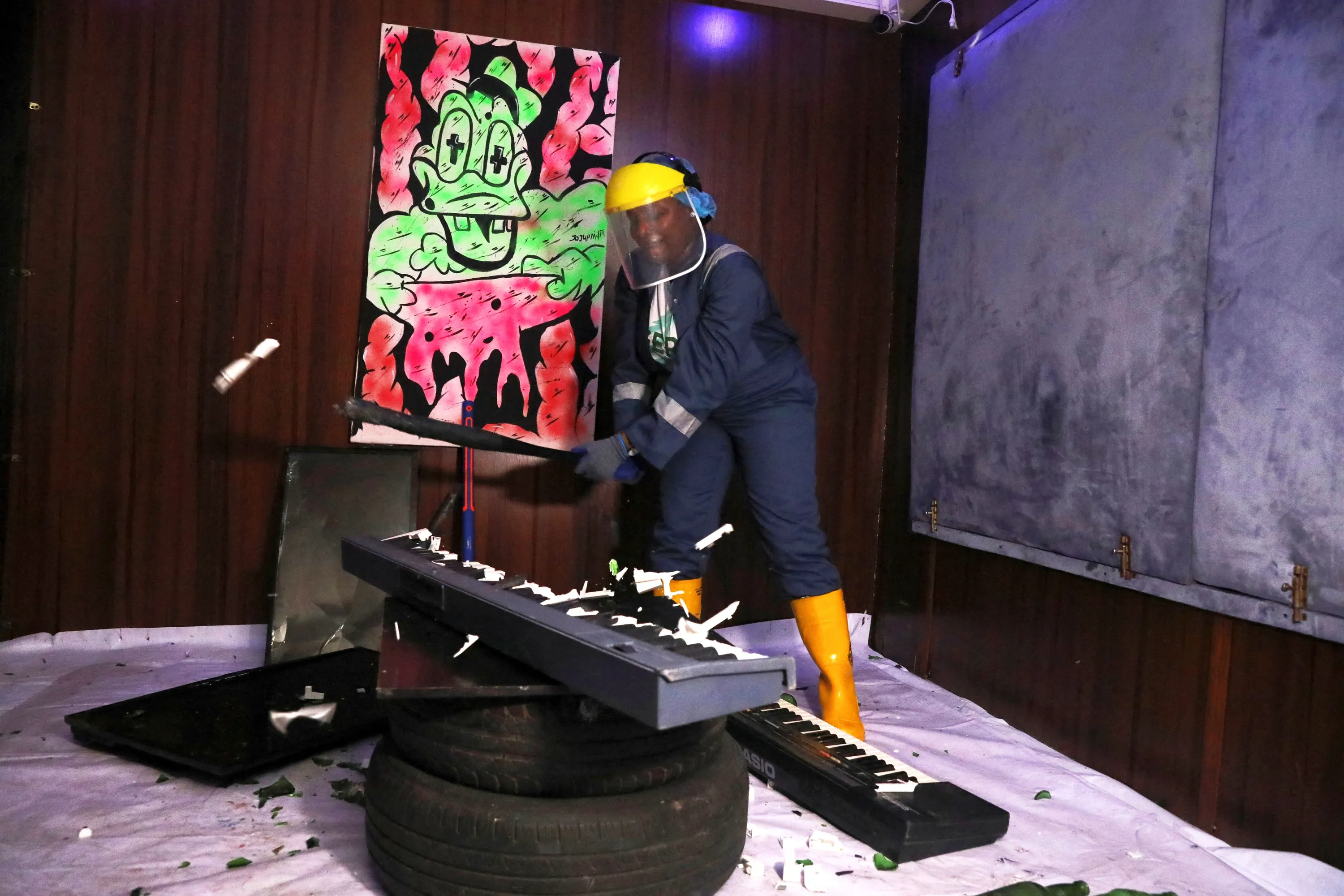Nancy Igwe smashes a musical keyboard at the Shadow rage room, a place where people can destroy objects to vent anger, in Lagos, Nigeria on November 21, 2023. (Photo by Temilade Adelaja/Reuters)