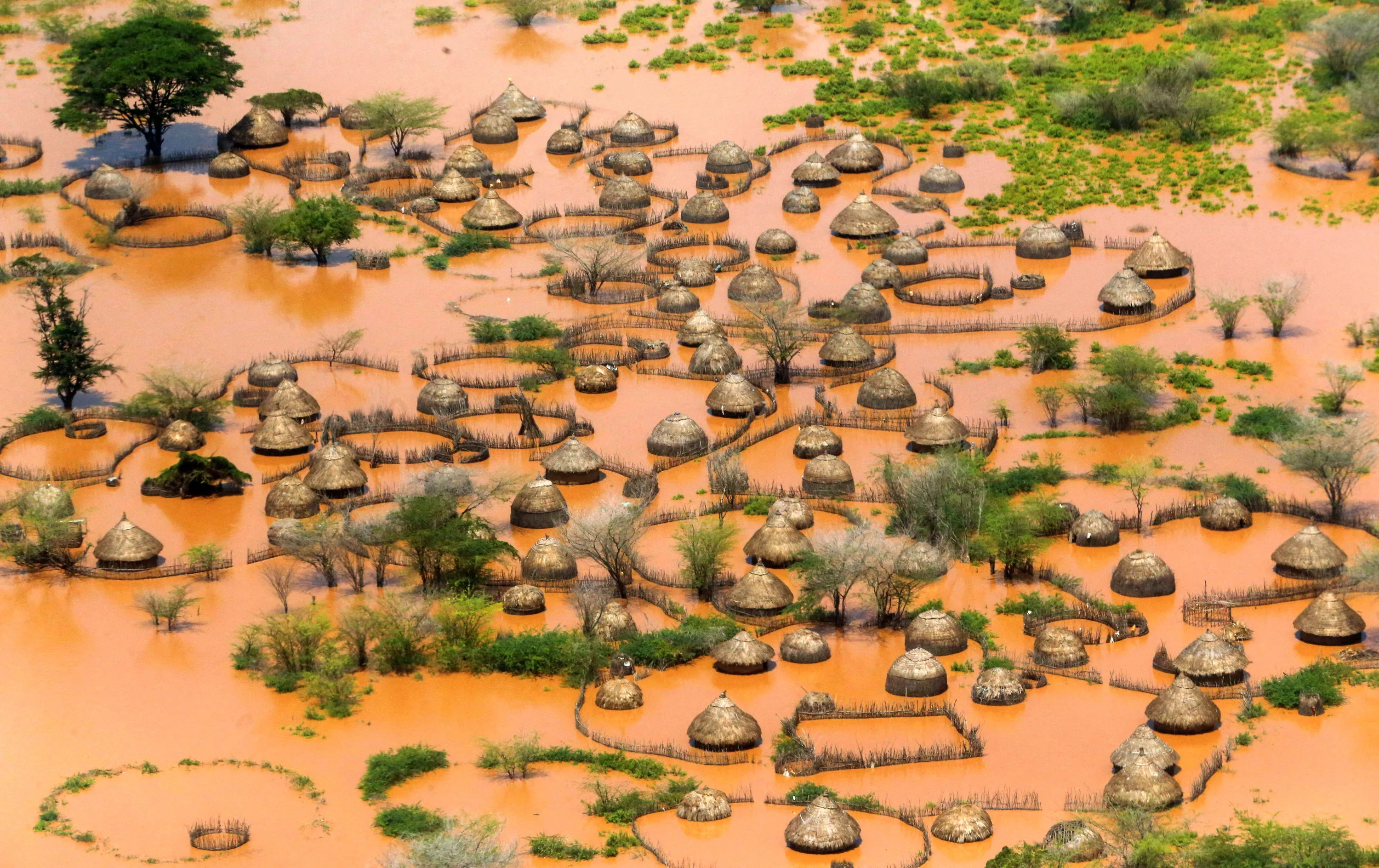 An aerial view shows a deserted and flooded traditional homestead following heavy rains in Garsen, Tana Delta within Tana River county, Kenya on November 23, 2023. (Photo by Thomas Mukoya/Reuters)
