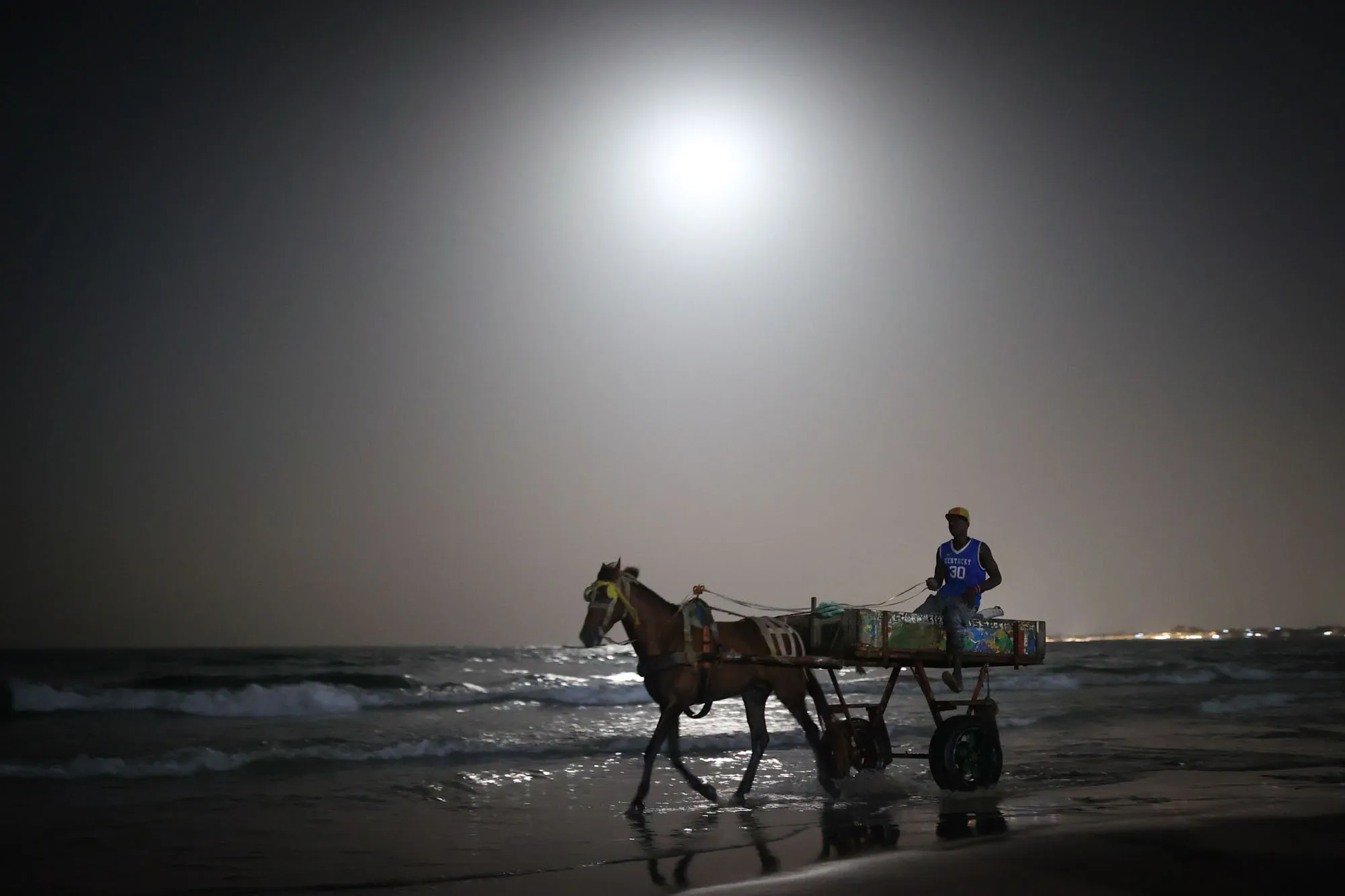 Workers carrying loads with horse carts on the ocean shore are seen in the light of the full moon appearing in the Yoff region, Dakar, Senegal on November 26, 2023. (Photo by Cem Ozdel/Anadolu via Getty Images)