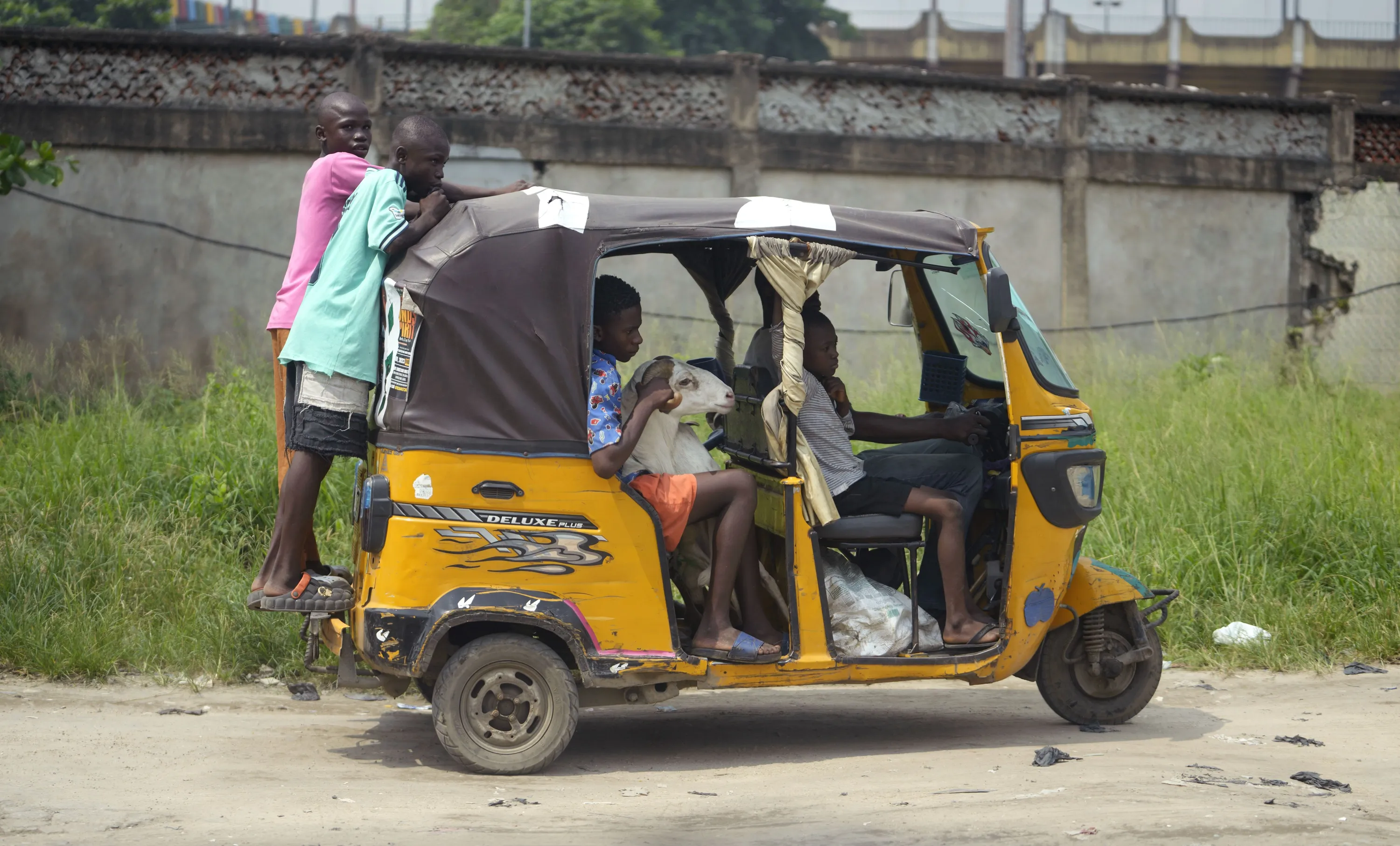A ram is transported in a rickshaw to venue of the ram fighting competition at the National Stadium in Lagos Nigeria, Sunday, December 3, 2023. Ram fighting is a sport between two rams with the same weight category held in an open field. (Photo by Sunday Alamba/AP Photo)