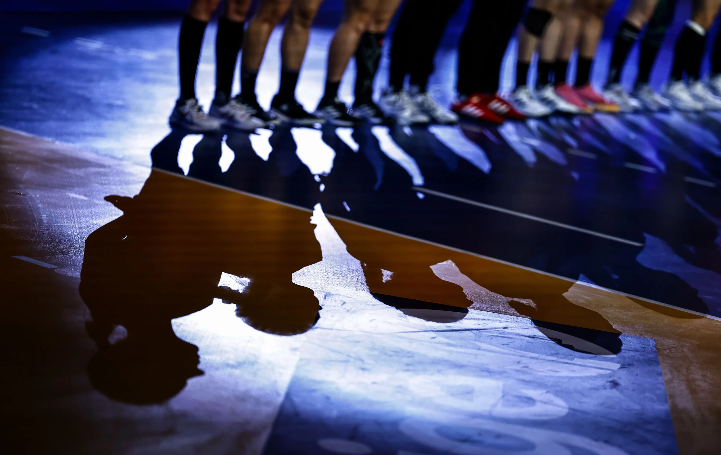 Shadows of Ukrainian players are casted before the IHF Women's World Handball Championship Group G match between Ukraine and Kazakhstan in Frederikshavn, Denmark, 03 December 2023. (Photo by Hannibal Hanschke/EPA/EFE)