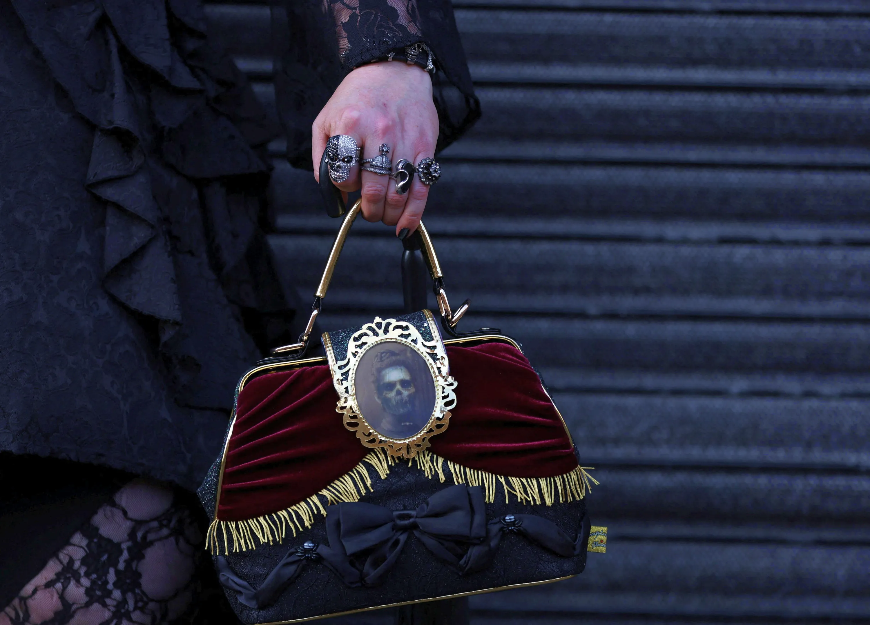 A woman poses with her bag during the Gothic Weekend in Whitby, Britain on October 28, 2022. (Photo by Lee Smith/Reuters)